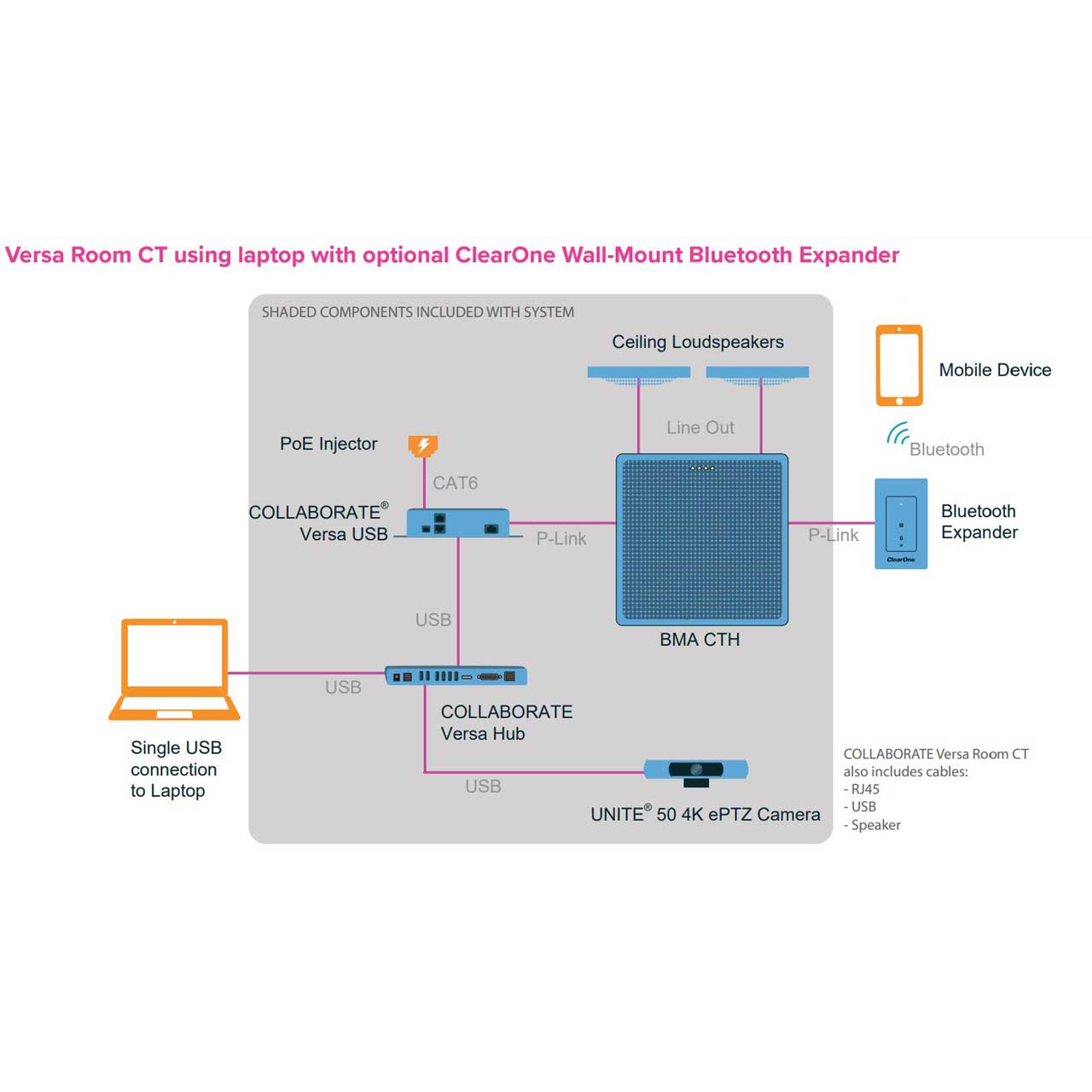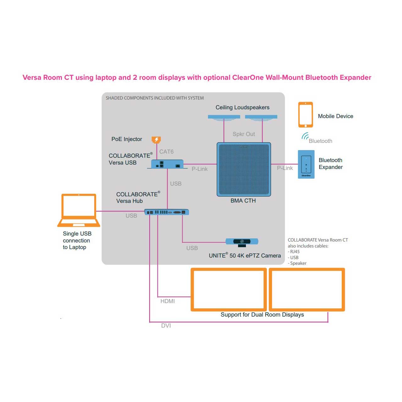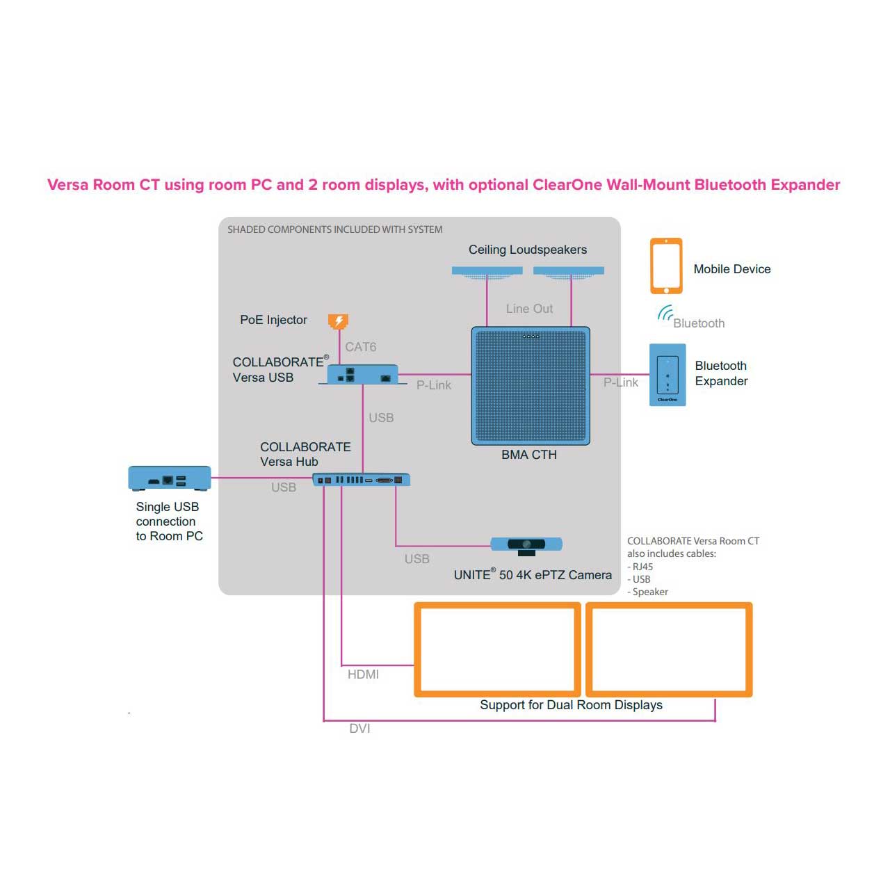 COLLABORATE Versa Room CT (930-3200-020) provides all of the equipment and accessories needed for exceptional meeting room cloud-based video conferencing with no external DSP needed - just connect it to a computer and displays.