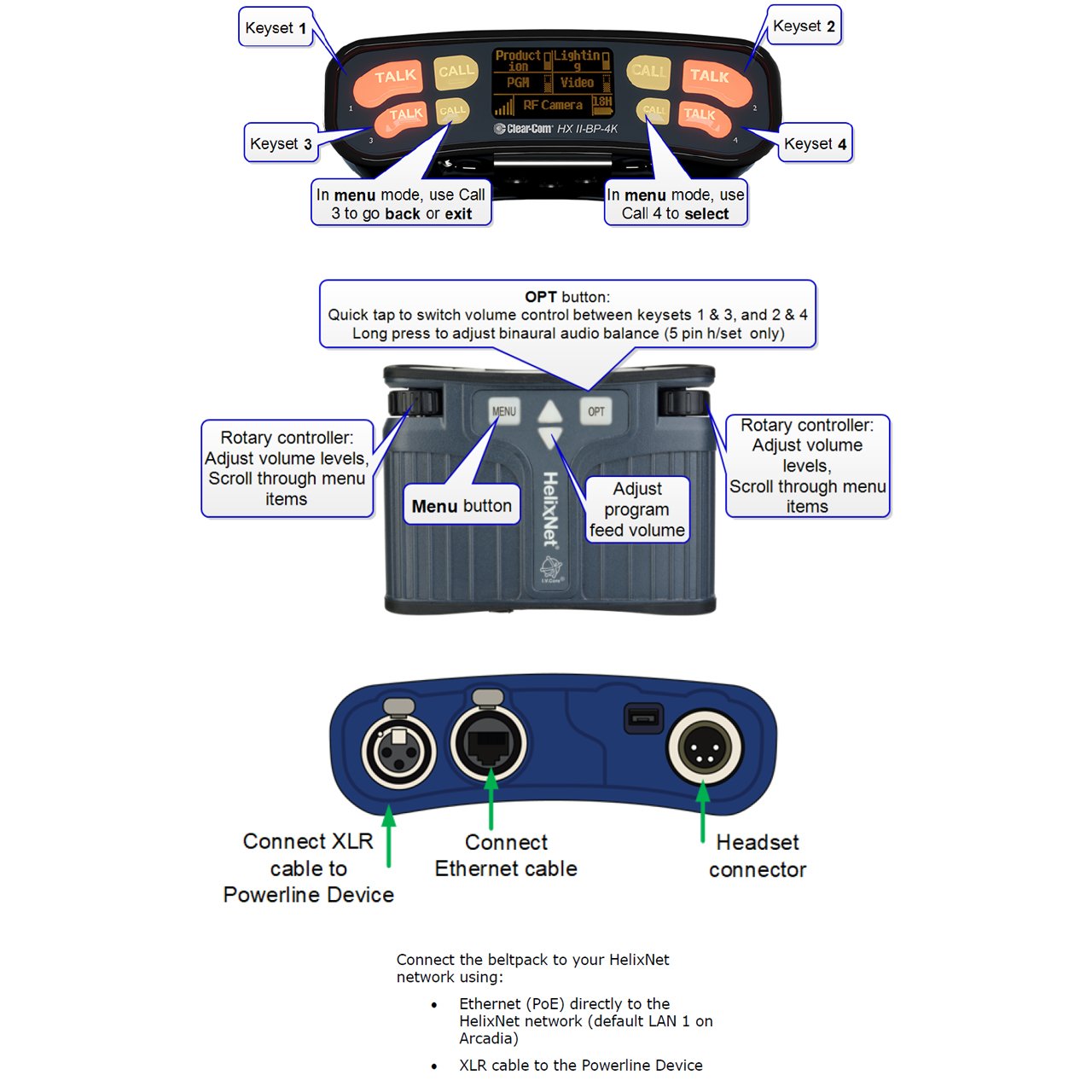 Clear-Com HelixNet HXII-BP-4K is a best-in-class multi-channel duplex digital intercom beltpack extending the capabilities of the HelixNet product family with the addition of a 4-key beltpack that works with existing HelixNet systems running on HMS-4X, and Arcadia. The HelixNet beltpack is a four-channel and program audio intercom user station hosted by Arcadia® Central Station or legacy HelixNet HMS-4X main station in a two-channel compatibility mode. The beltpack connects to the intercom system and via PoE Ethernet or XLR Powerline.