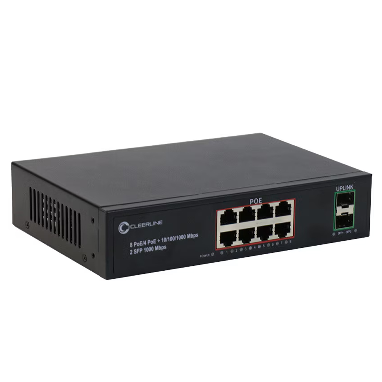 The Cleerline SSF-2SFPx8RJ45POE-1G PoE+ switch can be used for any 10/100/1000mbps link and supply industry-standard IEEE 802.3af/at power. Advanced auto-sensing algorithm gives power to 802.3af/at end devices.