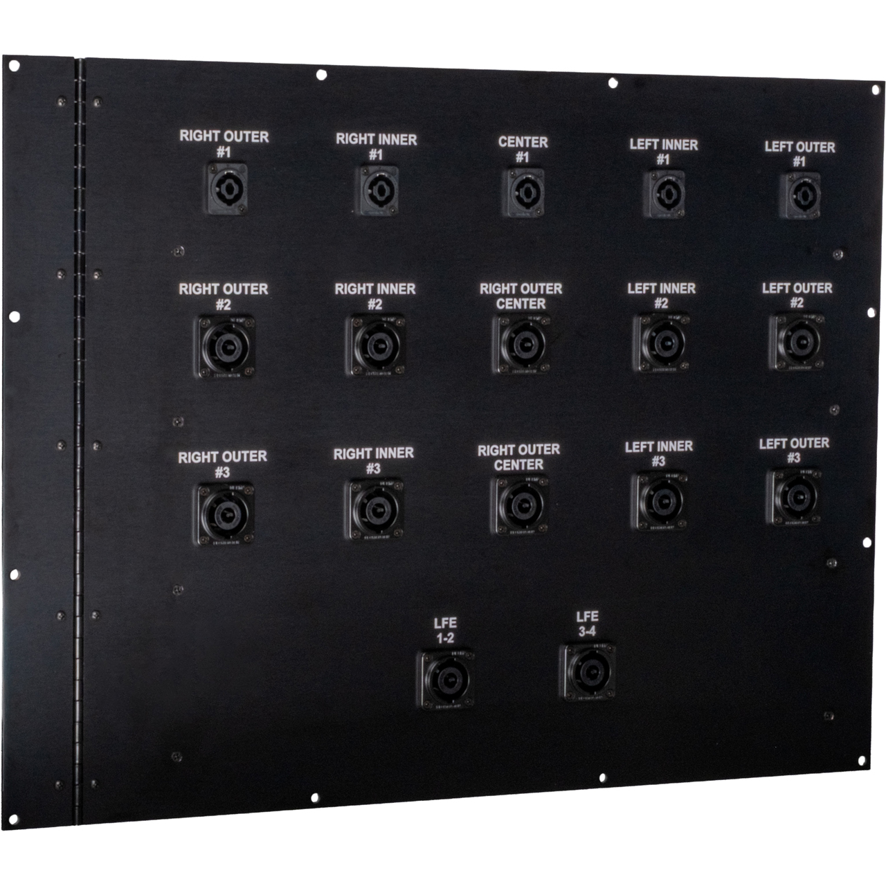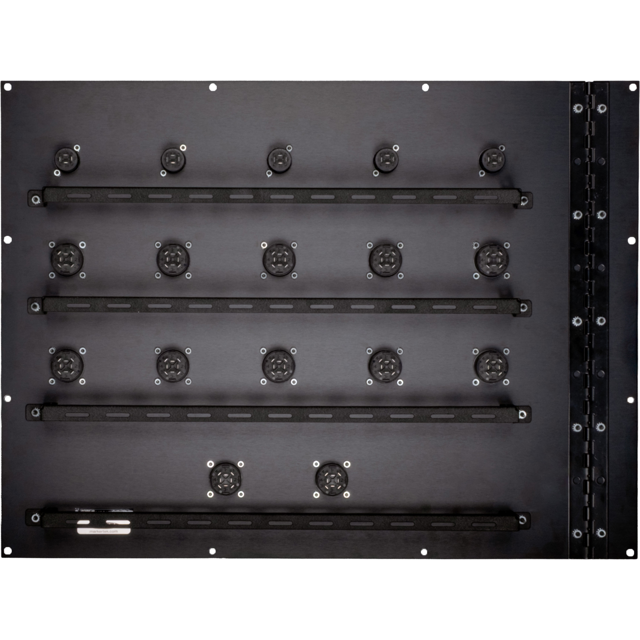 This custom 18" x 24" hinged rack panel features 17x speakON connectors. The connectors are accepted within audio equipment designed according to IEC 62368-1 due to its component certification according to IEC 61984. The speakON panel mount connectors are the standard chassis connectors for loudspeaker/amplifier interconnections and feature a unique metal locking system, making contact only once fully locked. The receptacles are robust, versatile and easy to terminate.