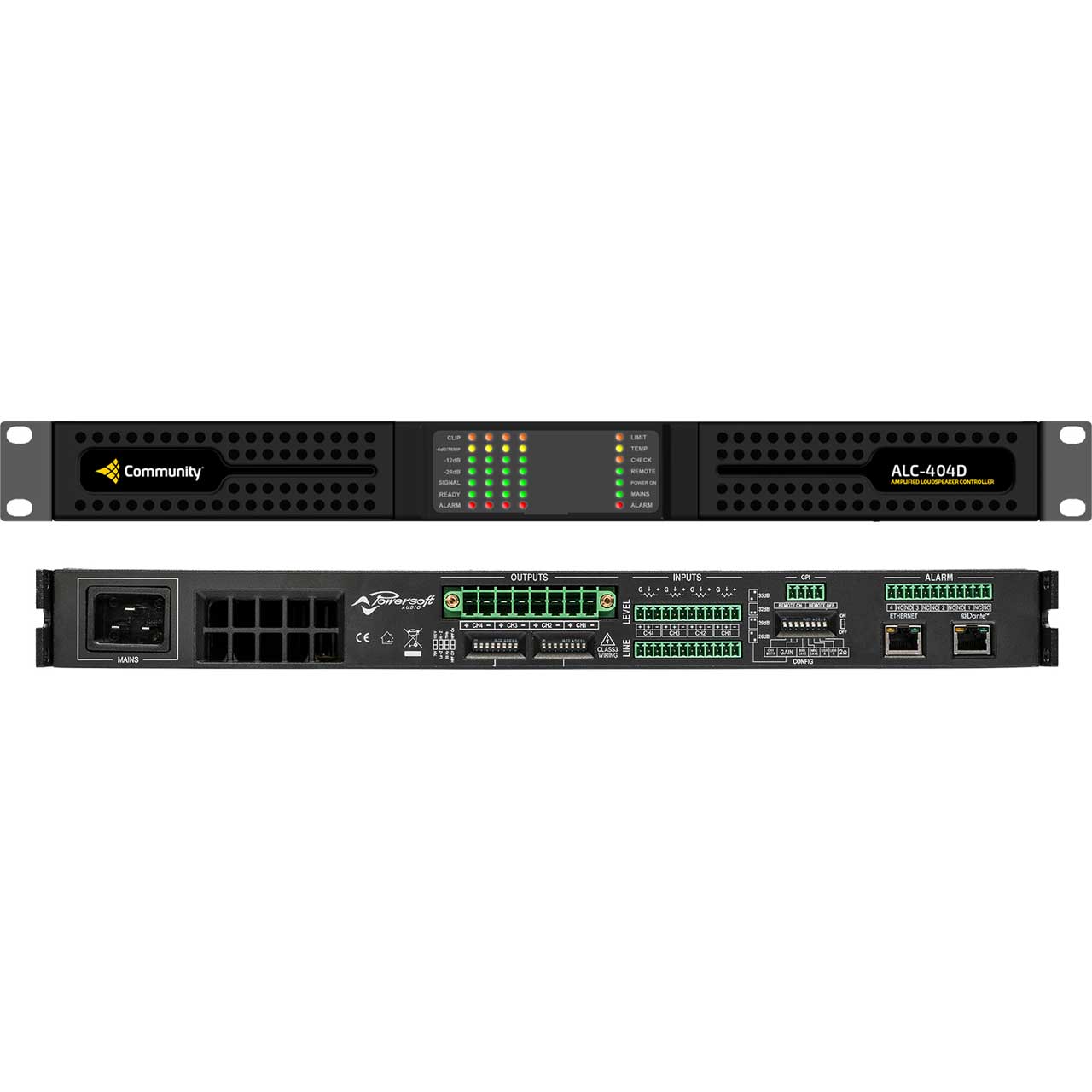 Community Pro ALC-404D provides all of the signal routing, zone switching, DSP processing, protective limiting, remote monitoring, and amplification functions needed between a mixer and the loudspeakers in virtually any Community Professional Loudspeakers application. Standard Ethernet communication protocols allow for fast system design, system control, and remote system monitoring. Analog and Dante® inputs are included in each model, for quick and easy integration into any new or existing system. Community-authored loudspeaker presets include equalization, high pass filters, and multi-stage limiters tailored to each model, ensuring consistent sound quality and full loudspeaker protection in every application.