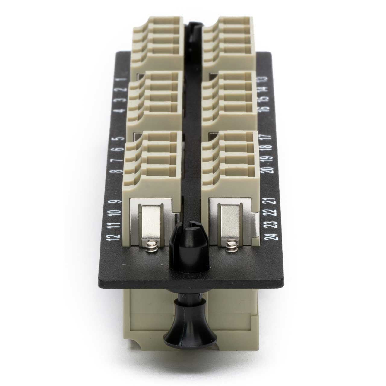 The CMX-MP24LCM adapter plate module quickly pops in and out of any Camplex MP series rackmount or wall box enclosure and delivers twelve duplex (24 fibers total) feed-thru patch points for LC multimode fiber.