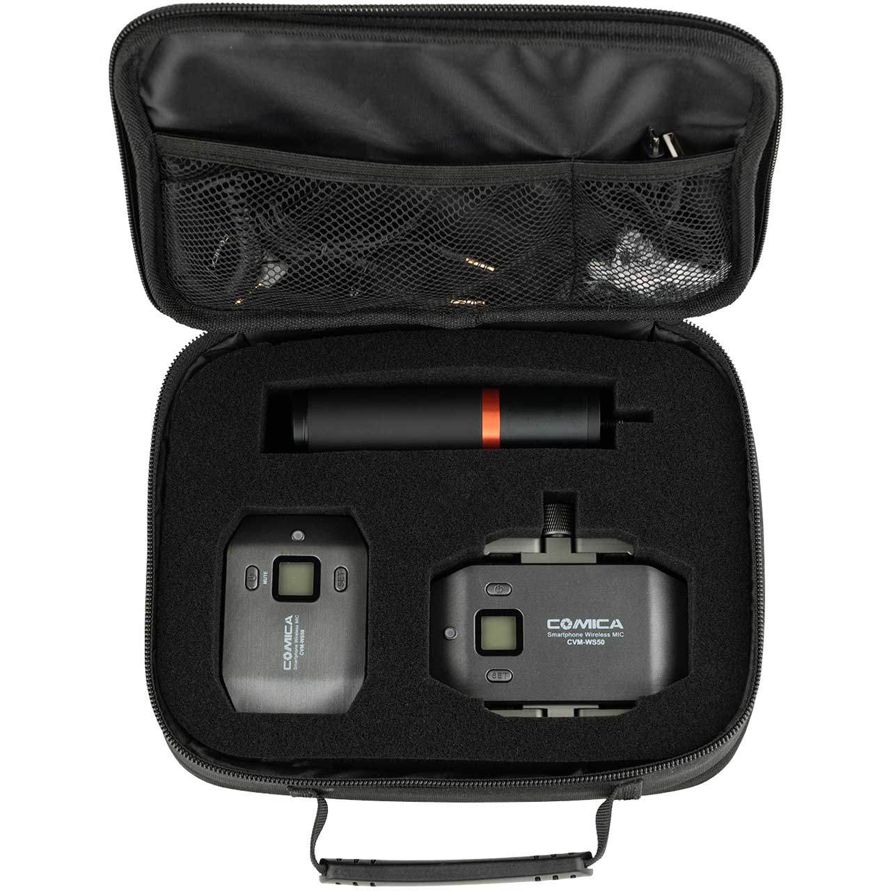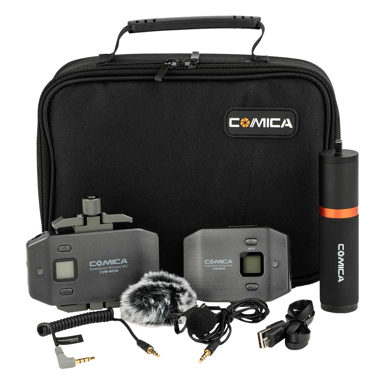 The Ikan CVM-WS50B is a wireless lavalier microphone kit for smartphones between 2.25-3.5 inches thick. The receiver for the wireless microphone doubles as the phone holder, and has 1/4-20 recesses on the top and bottom of the unit. These recesses allow the receiver to be mounted to a handle, like the one included in the kit, and for additional accessories like lights to be mounted to it. And included TRS-to-TRRS male-to-male 3.5mm cable is included to connect the receiver to the smartphone. There is also a 3.5mm port for headphones, so audio may be monitored in real time, and stepless volume adjustment on the receiver. Both the receiver and transmitter have LCD screens displaying battery life, mute status, and real-time audio level monitors.