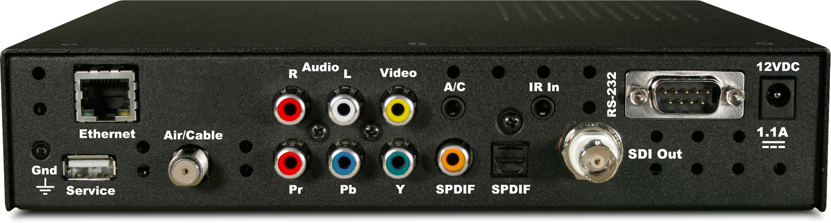 The integral HD-SDI output allows inclusion of 708/608 captioning, choice of AES stereo or AC-3 audio, and scaled output set to a constant 1080p, 1080i, 720p, or 480i resolution.
