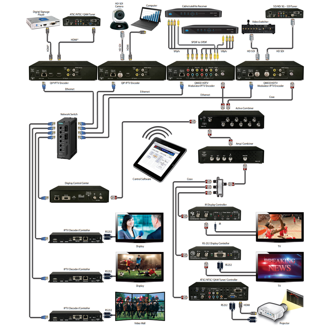 Dual hardware scalers accept content up to 1080p and compensate for non-broadcast and PAL frame rates. The QMOD-HDMI 2 can simultaneously output the content as a Multicast or Unicast IPTV stream. Options include easy front-panel setup, dual-language SAP audio, and Emergency Alert System. Dual unit rack mounting offers up to four programs per rack unit, with the ability to mix models to handle HDMI, SDI, Component, RGBHV and NTSC video sources.