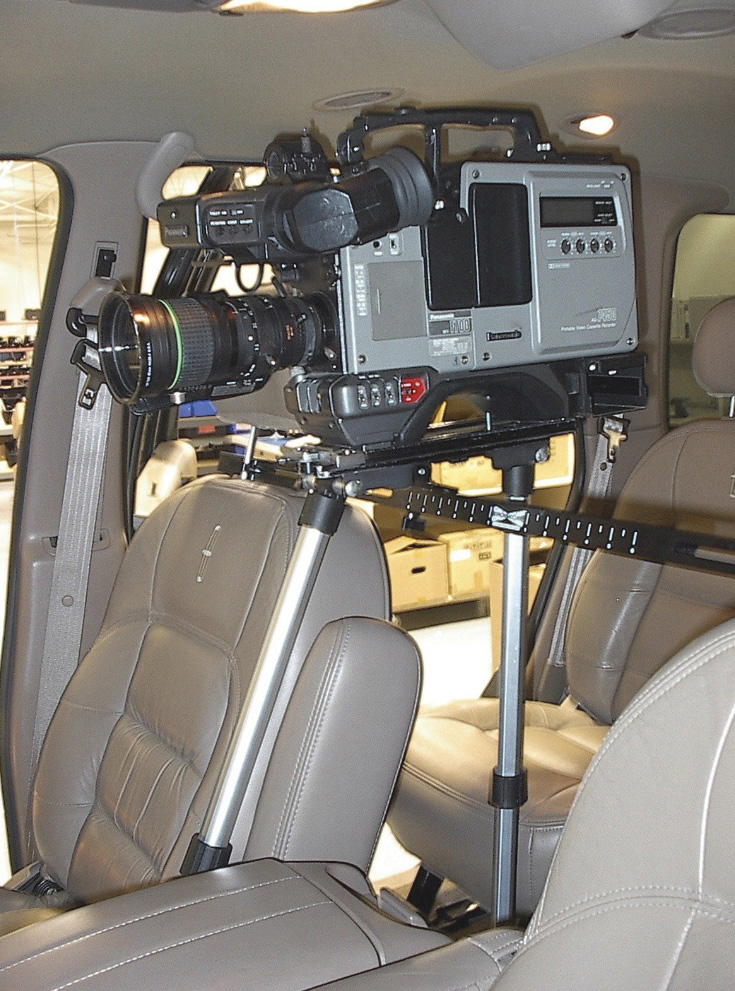 Camera mount designed for extreme conditions and high stability. Designed for the rigors of racing while delivering the highest levels of stability. The product is made of aluminum and connects the headrest of both front or rear seats. Utilizing a 48" rail that attaches to both seat headrests, the product features a removable platform with telescoping legs that will adjust downward and outward for additional support. The mount will then support up to two cameras and or a device weighing as much as 25 lbs. The product had proven to be extremely effective in performance driving conditions. The whole unit can be installed without the use of tools.