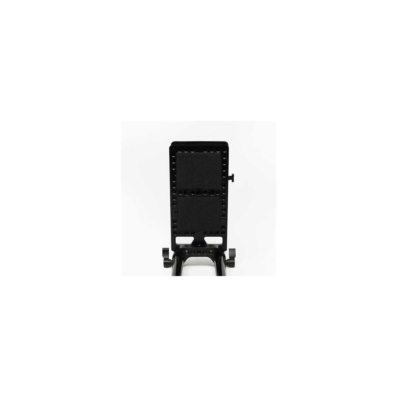 The cheese plate is configured with many 1/4-20 thread mounts for attaches devices, arms, etc., along with a soft Velcro rear backing to quickly attach a wireless audio RX, a wireless video RX, etc. without the need for additional hardware.