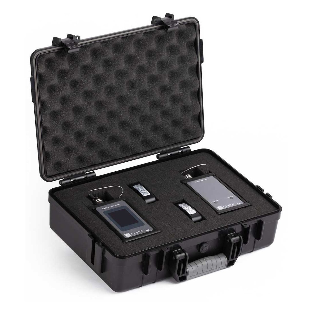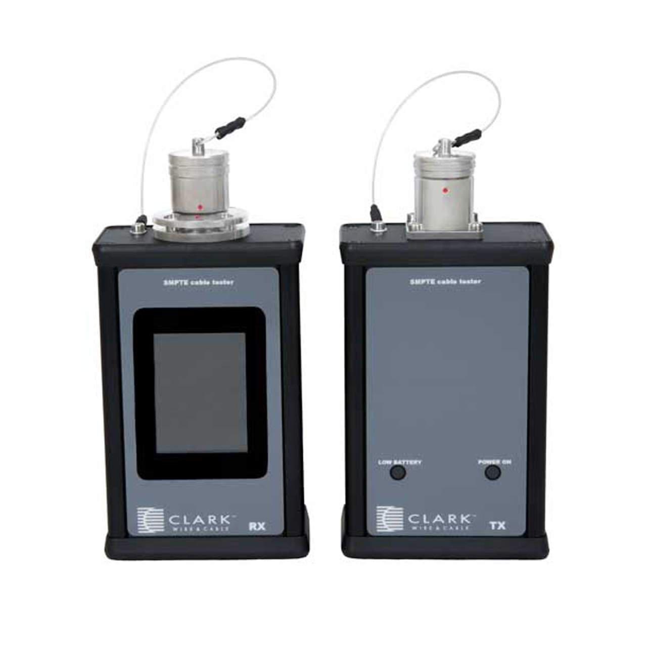 The Clark CWT-SMPTE is a two-piece test set designed specifically for testing both the fiber and copper elements of a terminated SMPTE 304/311 camera cable assembly. The fiber elements are tested for power loss and displayed in dB loss, while the copper elements are tested for multiple combinations of opens and shorts. Measurement are displayed on color touch screen display for easy viewing and operation.