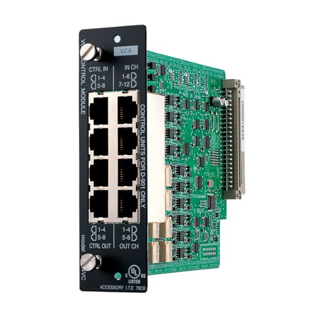 By the VCA controls from external equipment, this module permits the D-901's gains of 12 inputs and 8 outputs to be controlled. By the contact input controls from external equipment, it permits preset memory recall, gain control, stereo input selection and channel ON/OFF operation plus tally outputs.