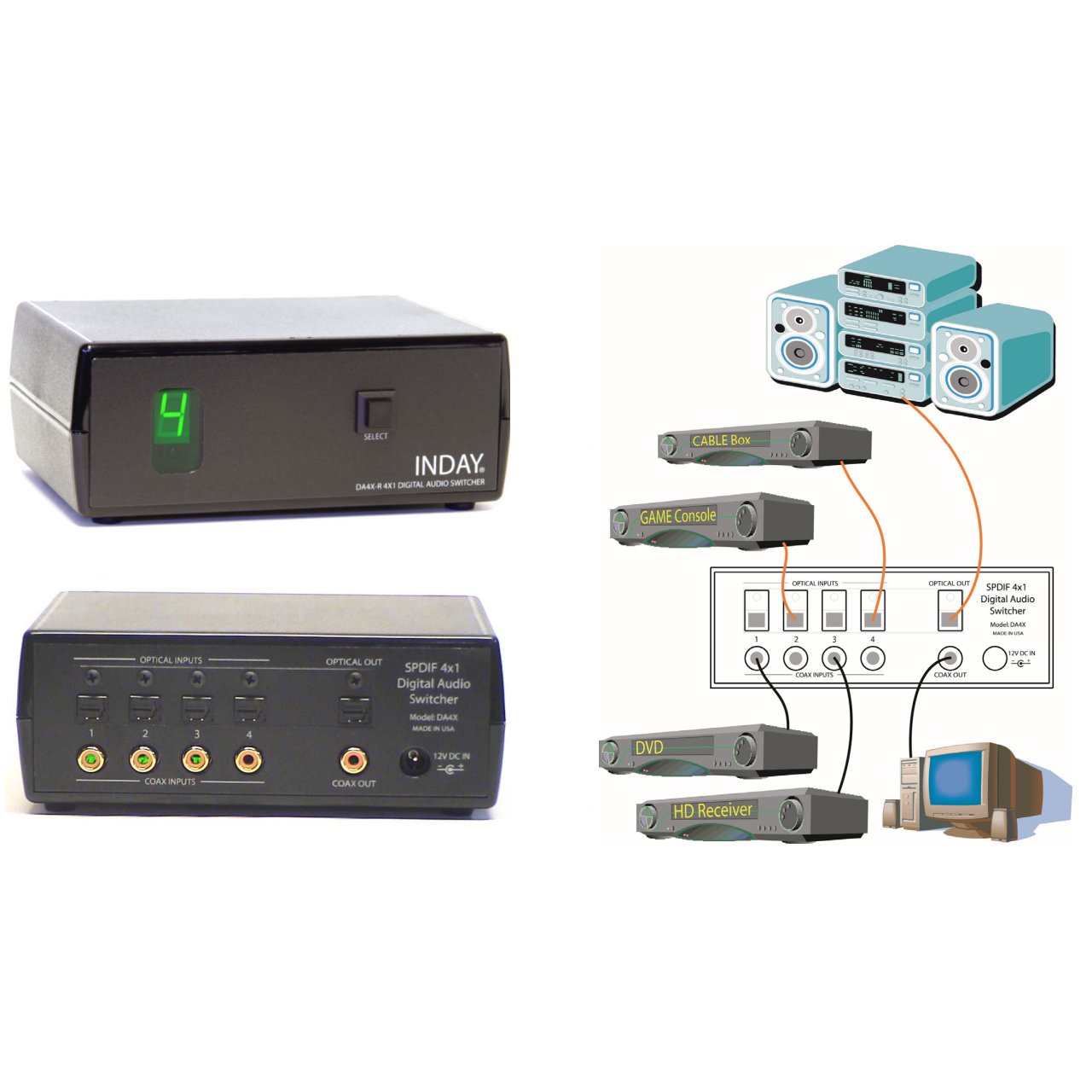 • SPDIF Digital Audio 4-Input to 1-Output Switcher.