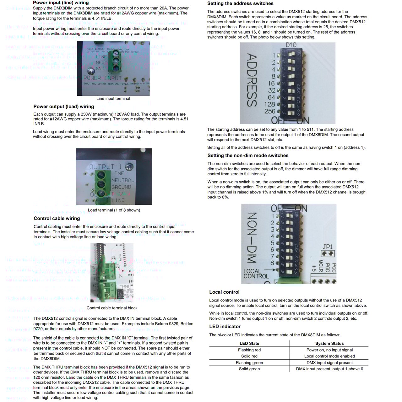 Features include local control for load testing, dim/non-dim per output, toroidal filtering, a troubleshooting LED and an optically isolated DMX input. Rated at 250 Watts per output, the dimmer has self resetting overload protection and is powered by a single 20A branch circuit.