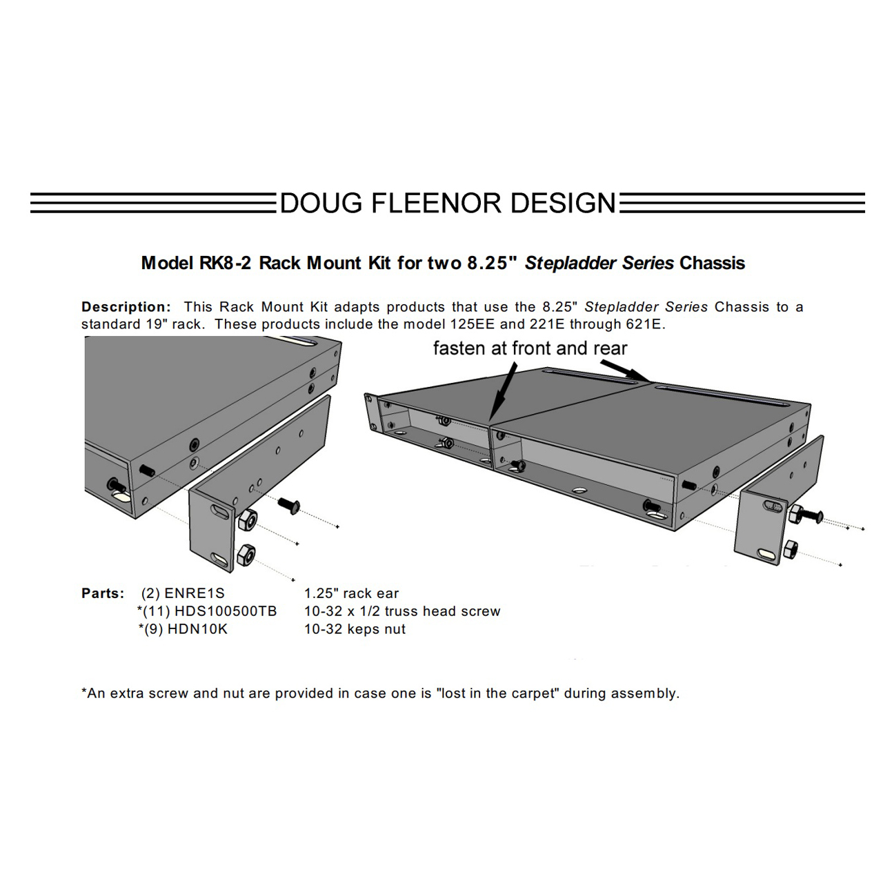 The Doug Fleenor Design RK8-2 is a 19" rack mounting kit for two 8.25" Stepladder Series Chassis mount products covering the 125EE and 221E through 621E.