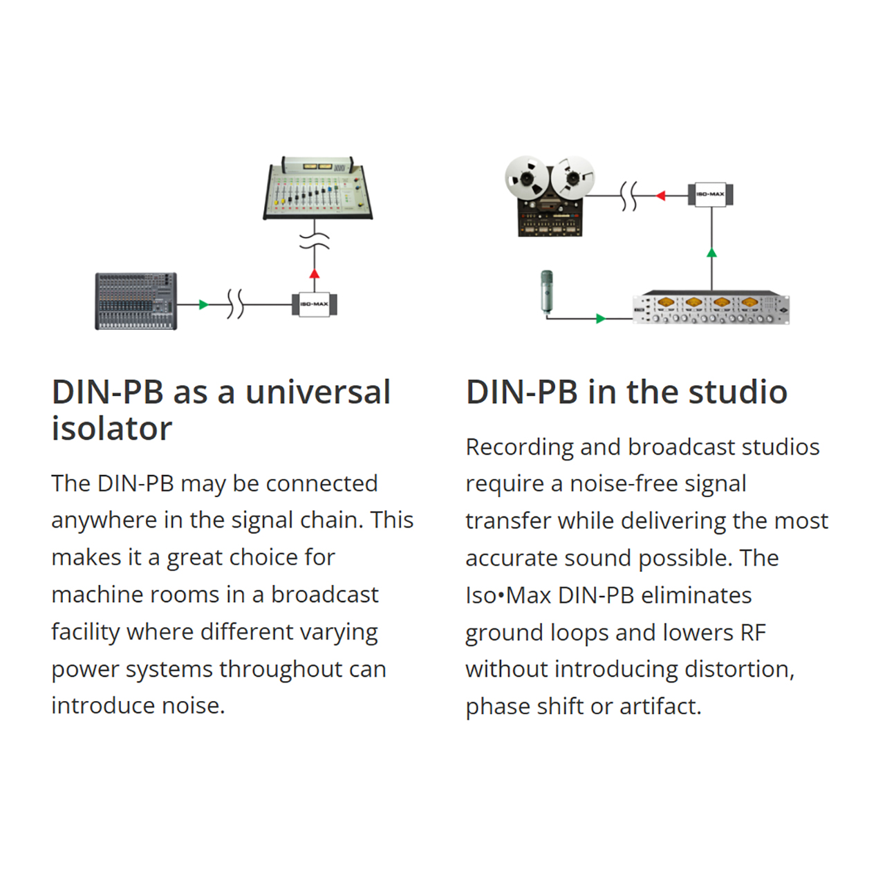 The DIN-PB may be connected anywhere in the signal chain. This makes it a great choice for machine rooms in a broadcast facility where different varying power systems throughout can introduce noise.