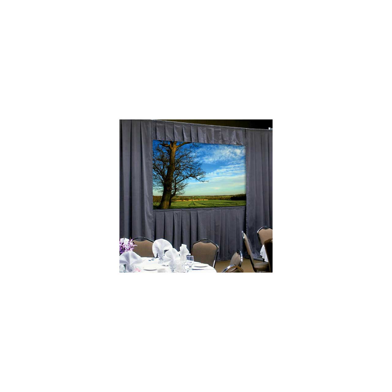 Fast-Fold Deluxe Drapery Presentation Kits are box pleated and attach with snaps to Fast-Fold screens to give a finished aesthetic.