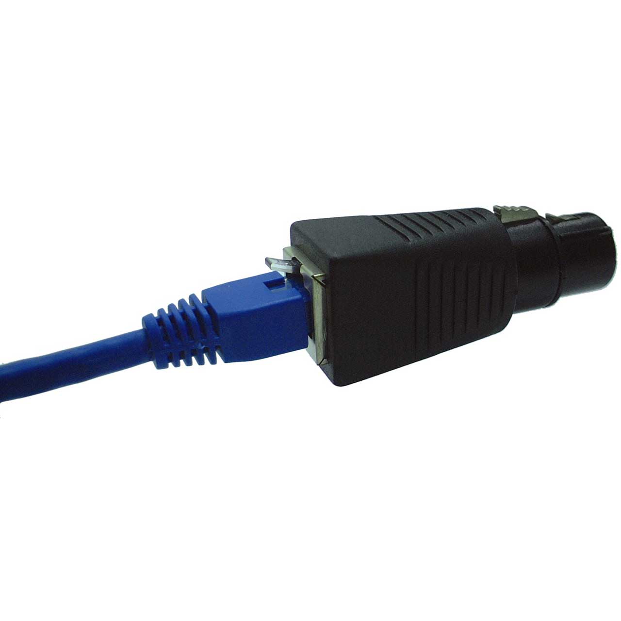 The DMX-3XF-CAT5 is an adapter to convert a DMX512 XLR connector to a RJ45 connector. The XLRJ45 adapter makes it possible to use any CAT-5 ethernet cable as a DMX512 cable. XLRJ45 is available in four versions, 3-pin male or female XLR or 5-pin male or female XLR. The different adapters can be mixed to make for example a 5-pin to 3-pin cable. XLRJ45 is very useful for making a DMX512 cable quickly and at a very low cost.
