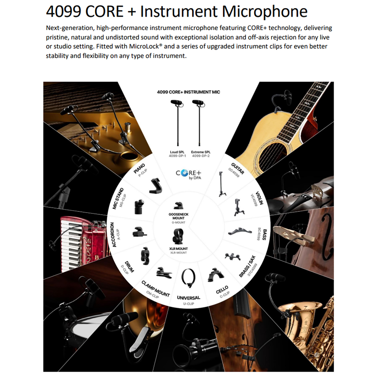 (The 4099 CORE+ is fully backwards compatible with all generations of DPA instrument clips and with accessories featuring MicroDot connector, ensuring seamless integration with your existing setup.)