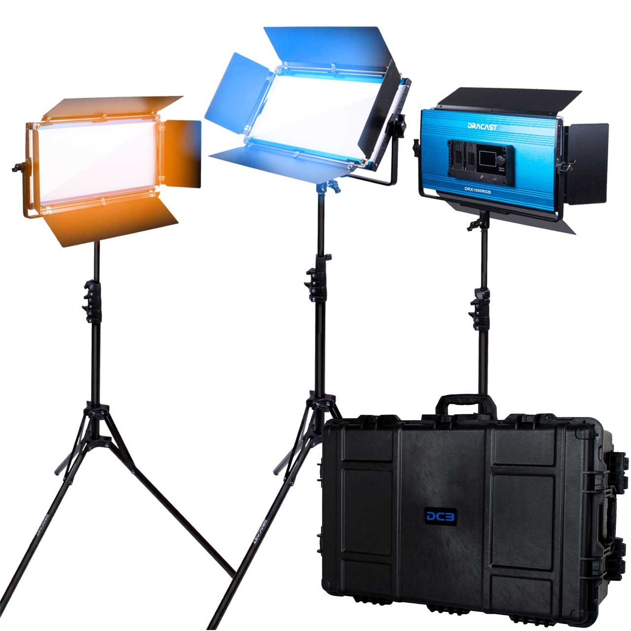 The Dracast X Series 3 Light Kit includes lights, barn doors, light stands, and a resin-reinforced injection molded plastic travel case. Other accessories are available and sold separately.