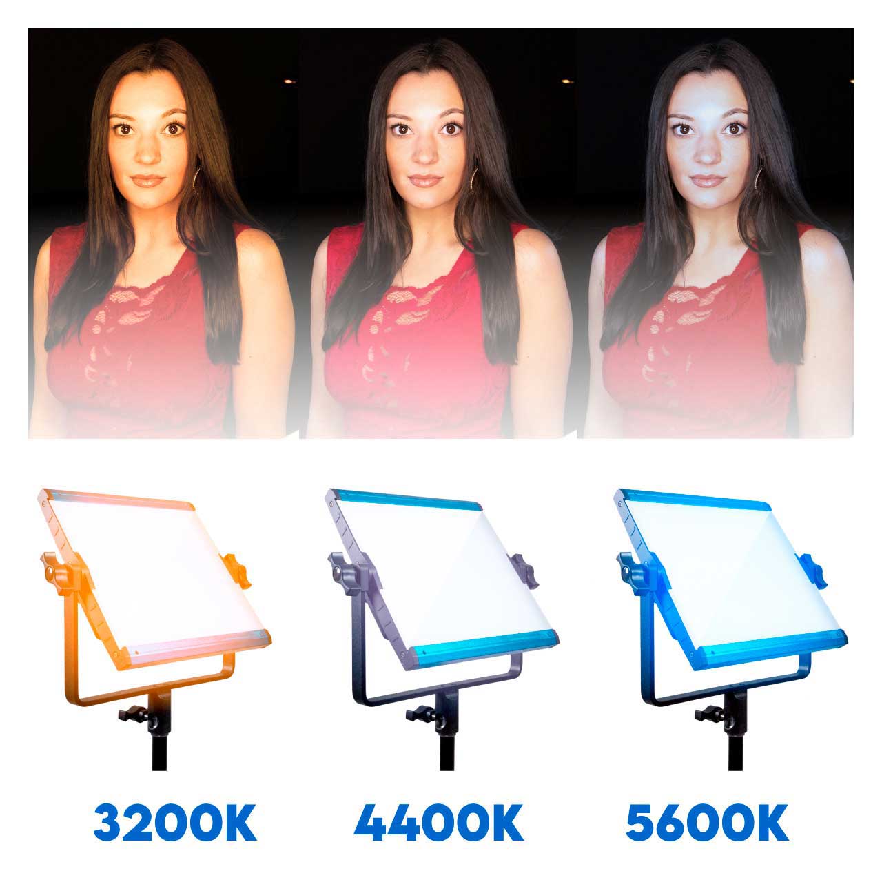 Adjust the color temperature from 2800K - 6500K to match other light sources or ambient light in your shooting environment. Match subject skin tone easily and quickly without the need for color correction filters