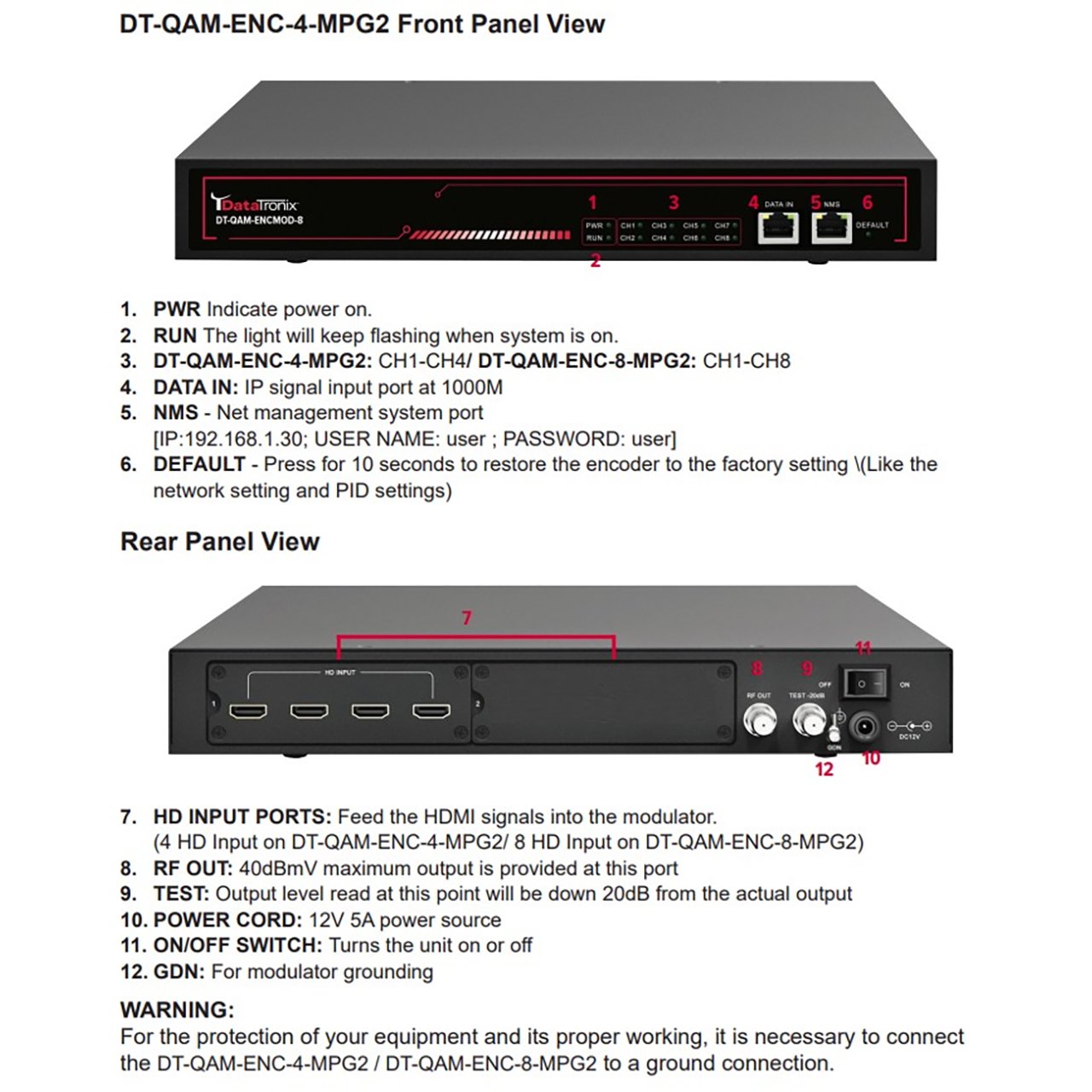 The DataTronix DT-QAM-ENC-4-MPG2 QAM Encoder Modulator is the ideal solution for smaller-scale HD video distribution projects where reliability and flexibility are crucial. This unit takes up to four video sources, such as satellite receivers, Blu-ray players, or IP cameras, and converts them into QAM channels that compatible televisions can tune into, with no set-top boxes required. Supporting both MPEG-2 and MPEG-4 AVC (H.264) formats, the encoder ensures seamless compatibility with modern TV systems, making it easy to drop into existing infrastructures without hassle. With flexible channel mapping, installers can customize channel lineups to fit each application. Ideal for hospitality, education, healthcare, and commercial AV projects.