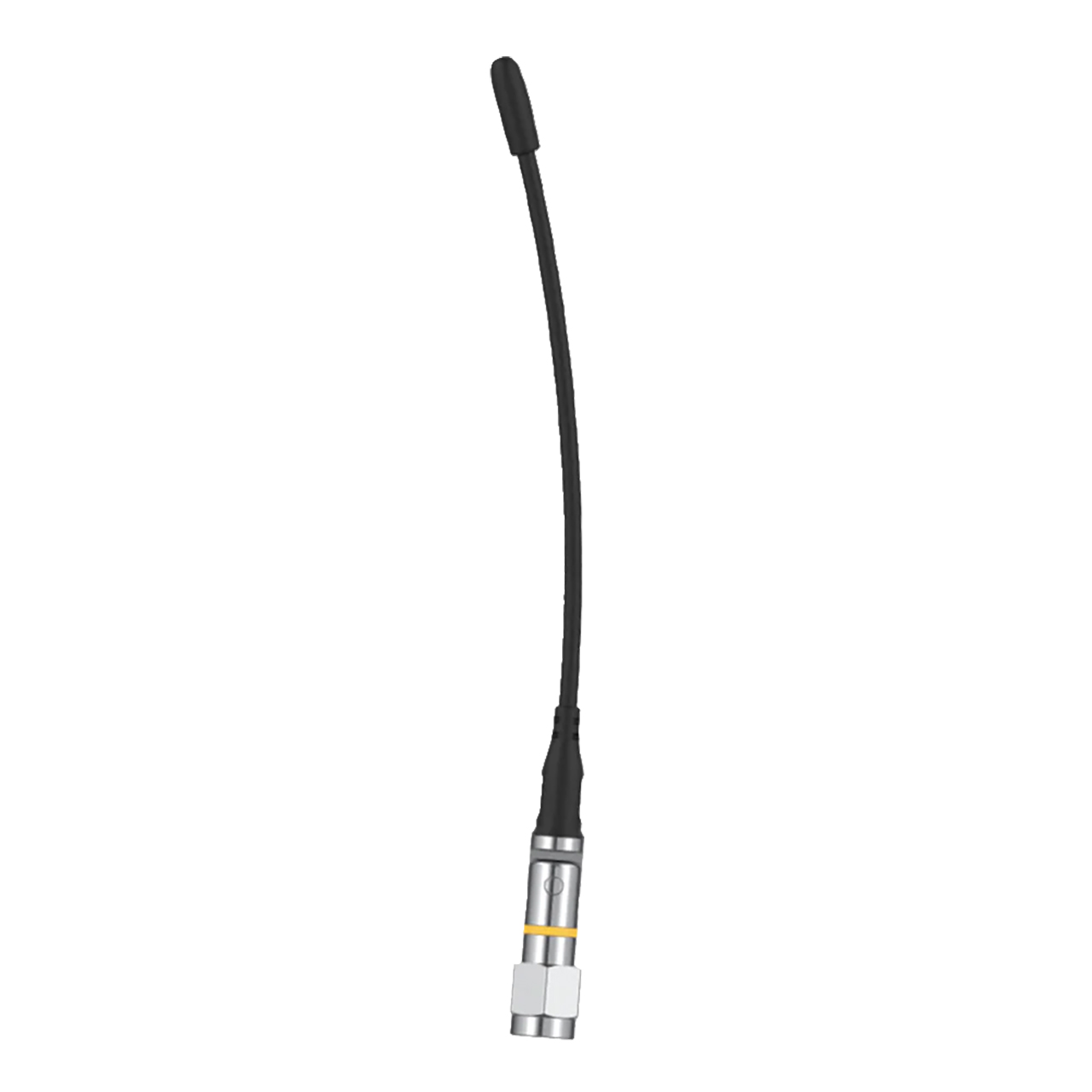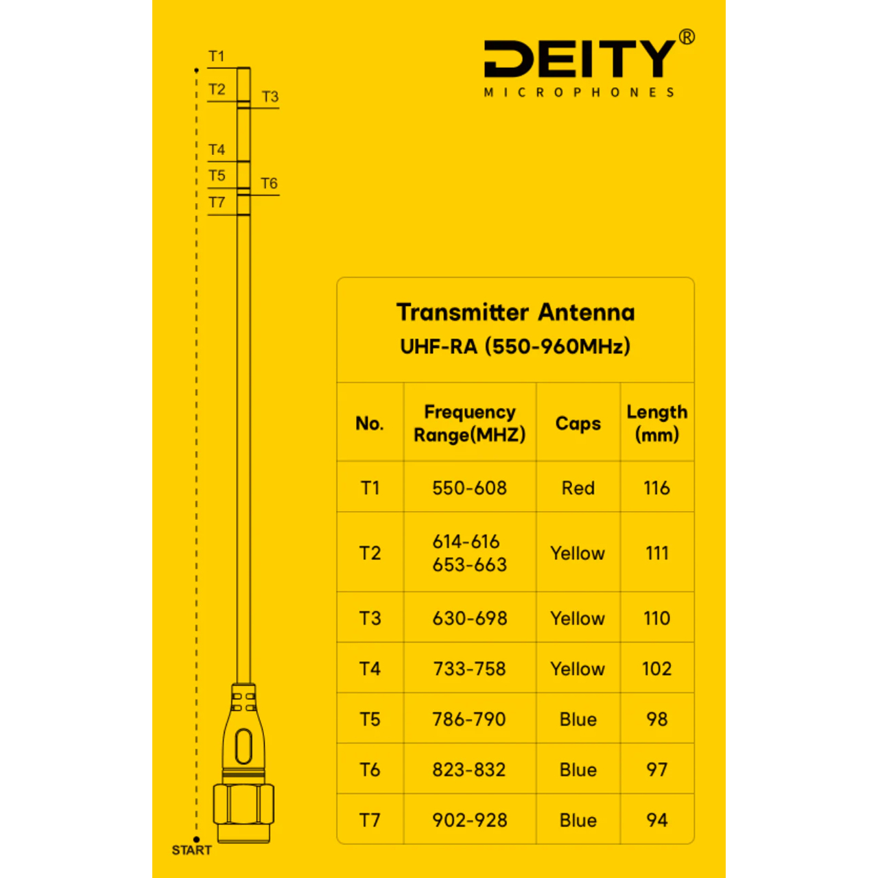 The Deity Microphones UHF-RA is a replacement antenna for the Theos camera-mount receiver. The antenna features an elbow joint for ergonomic positioning and can be cut to length to accommodate different frequency needs. A chart is included so you know how long to cut the antenna for the corresponding frequency band (550MHz - 960MHz). Different color-coded caps are also included to help identify corresponding frequency bands.