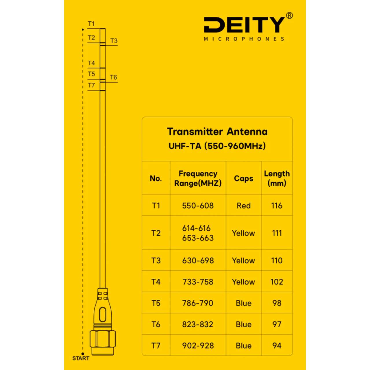 The Deity Microphones UHF-TA Theos is a replacement antenna for the Theos bodypack transmitter. It can be cut to length to accommodate different frequency needs. A chart is included so you know how long to cut the antenna for the corresponding frequency band (550MHz - 960MHz). Different color-coded caps are also included to help identify corresponding frequency bands.