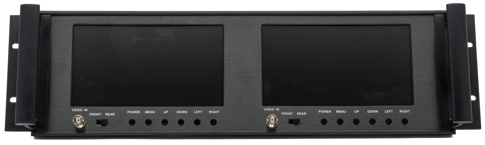 A cost effective dual 7" screen rackmount video monitor for composite video applications where a good no-frills quality is required.
