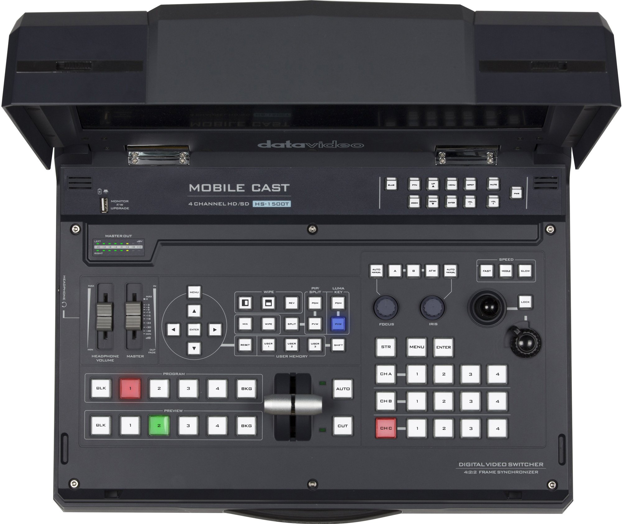 Datavideo's HS-1500T Hand-carry Mobile Switcher, the cutting-edge technology that supports Full HD 1080P, is designed for broadcast of live events and TV programs with a need for mixing a wide variety of video and audio sources. The HS-1500T is a highly valuable solution for religion, education and AV markets.