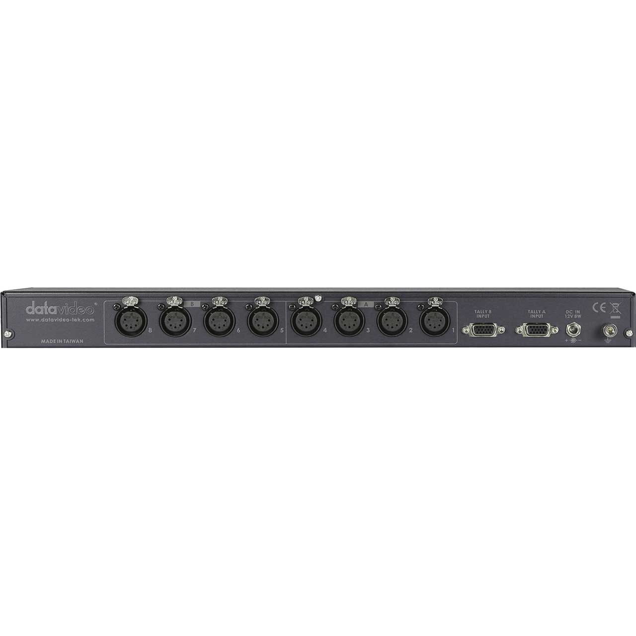 The Datavideo ITC-100 is an 8 remote user and base station wired intercom with included tally lights that can use low cost headsets (included) or high quality professional units. Users are connected to the base station via belt packs with the included 65' 5-pin XLR cables. The beltback can be connected with a cable up to 650' from the base station.