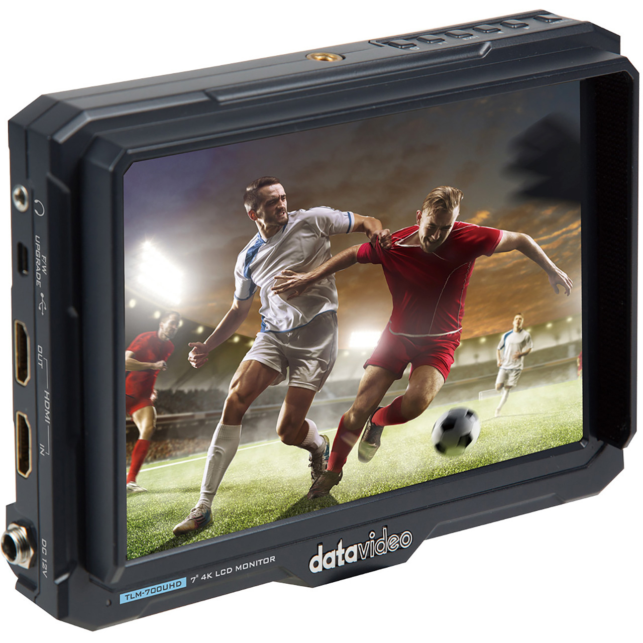 Datavideo's TLM-700UHD LCD Monitor accepts 4K 50/60p inputs and displays them on a 7" screen. The monitor is a 1920x1080 Full HD panel which provides 170° of viewing angle. The field monitor supports both DCI 4K and Ultra HD signal inputs and outputs.
