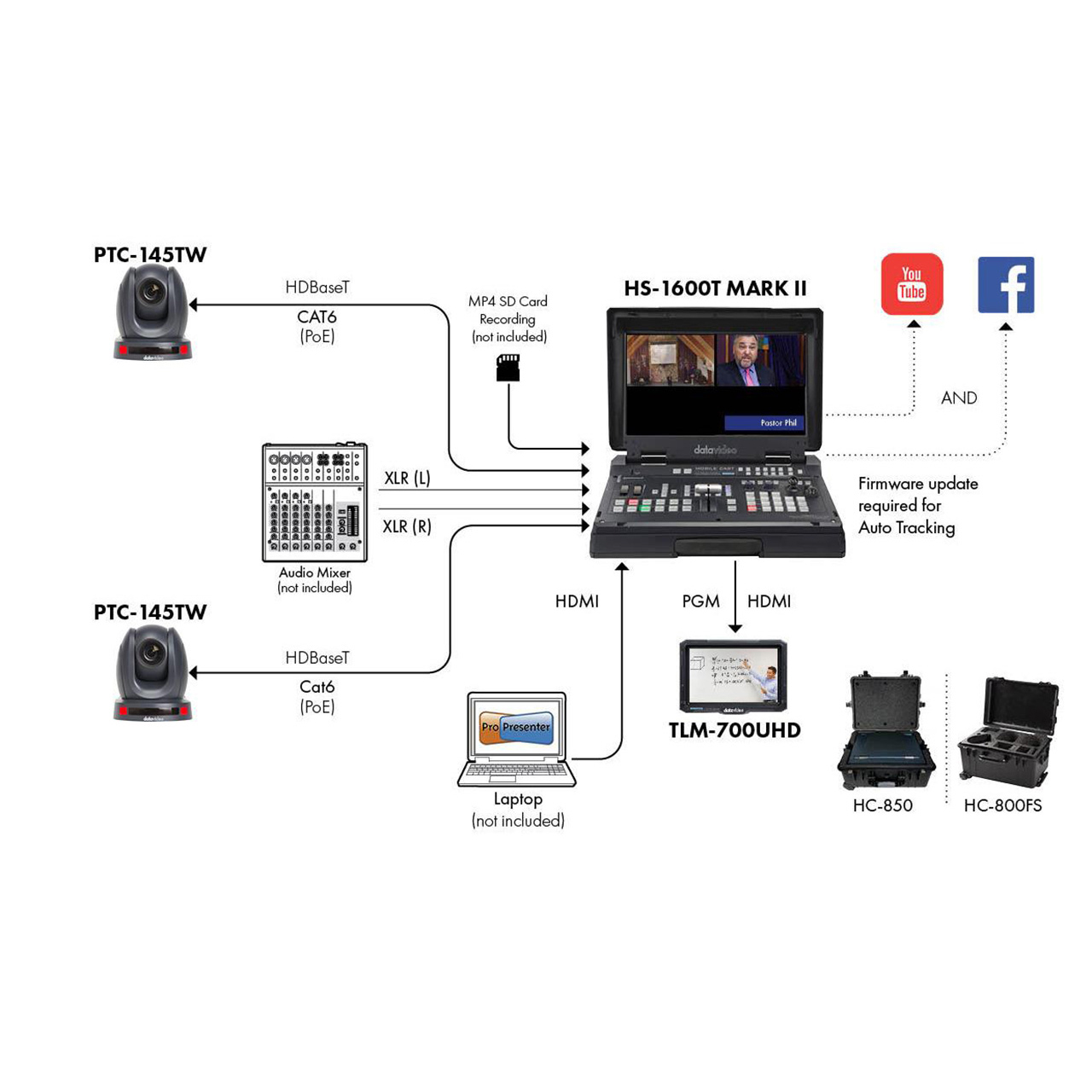 The Datavideo Portable C-AT Bundle uses two Auto Tracking HDBaseT PTZ cameras and a 7" 4K LCD Monitor for a streaming and recording workflow.The HS-1600T MARK II brings a new level of simplicity to production workflows. You'll set up faster and easier thanks to its portable "briefcase" design and HDBaseT Technology. Now with Auto Tracking camera control, it makes it even easier for the operator. And thanks to its built-in H.264 web streaming encoder, you can stream your show to virtually any CDN like YouTube and Facebook in no time.