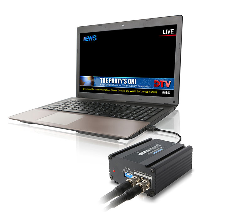 The TC-200 works as a DSK and offers Key and Fill signals to your HD switcher (720p or 1080i). Connected to your laptop via an HDMI cable, either the CG-200 starter software or the CG-300/350 full-featured software may be used. The TC-200 is packaged in the same rugged aluminum extrusion housing used for our DAC Converters. It can go anywhere your laptop goes.