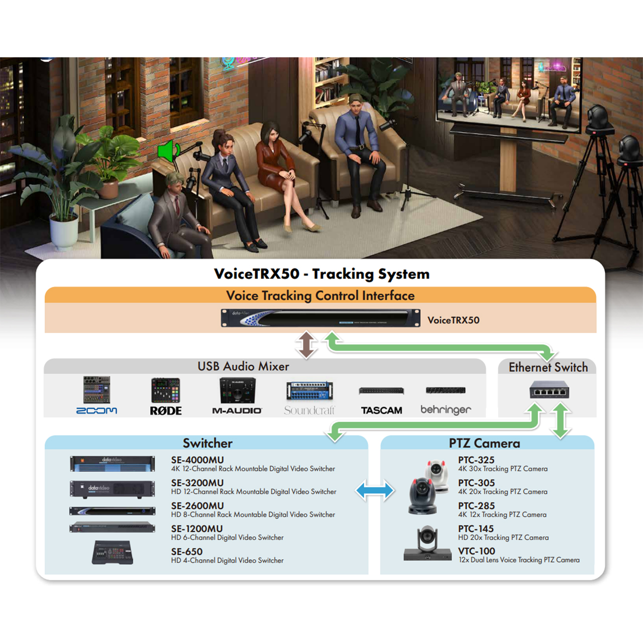 VoiceTRX50 eliminates the need for a production operator. The system automatically follows the active speaker using audio signals from USB mixers, delivering clean, broadcast-style switching without showing camera movement. When paired with Datavideo switchers, it also supports CG subtitles for real-time speaker identification.