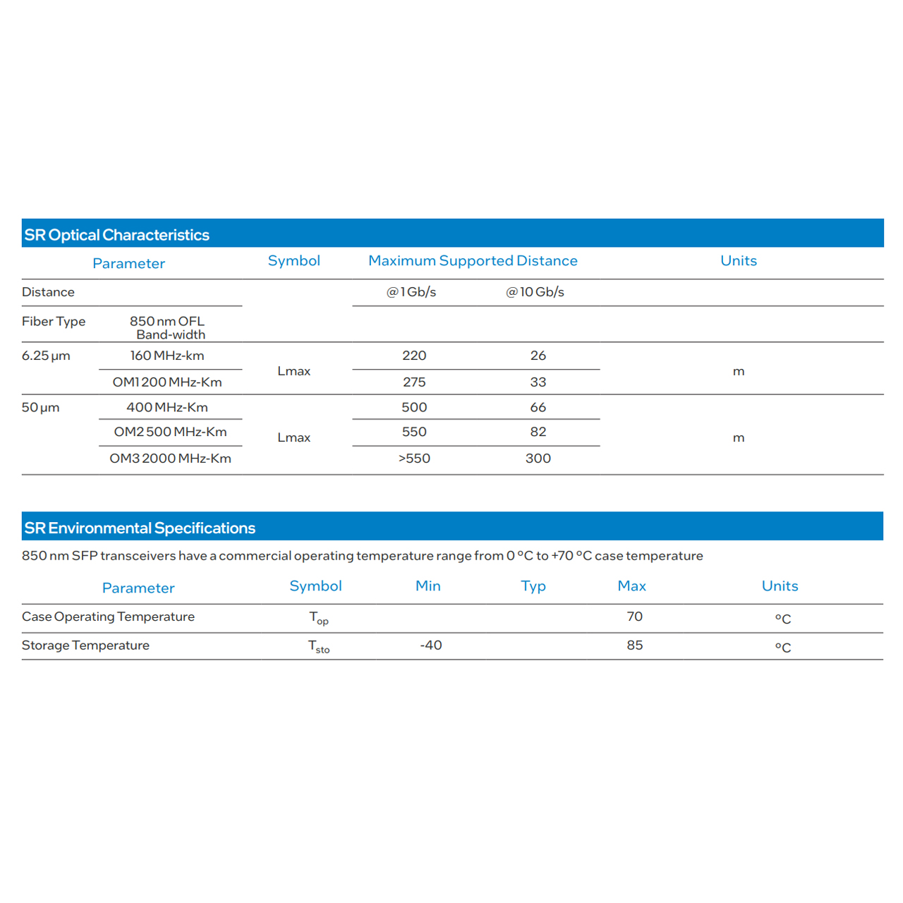 When you need to send Ethernet connections over 50ft, Intel® E10GSFPSR Ethernet SFP+ SR Optic modules can extend the reach to 984ft or longer. This optical module supports both short range and long range distances with 10 Gigabit Intel® Ethernet Network Adapters.