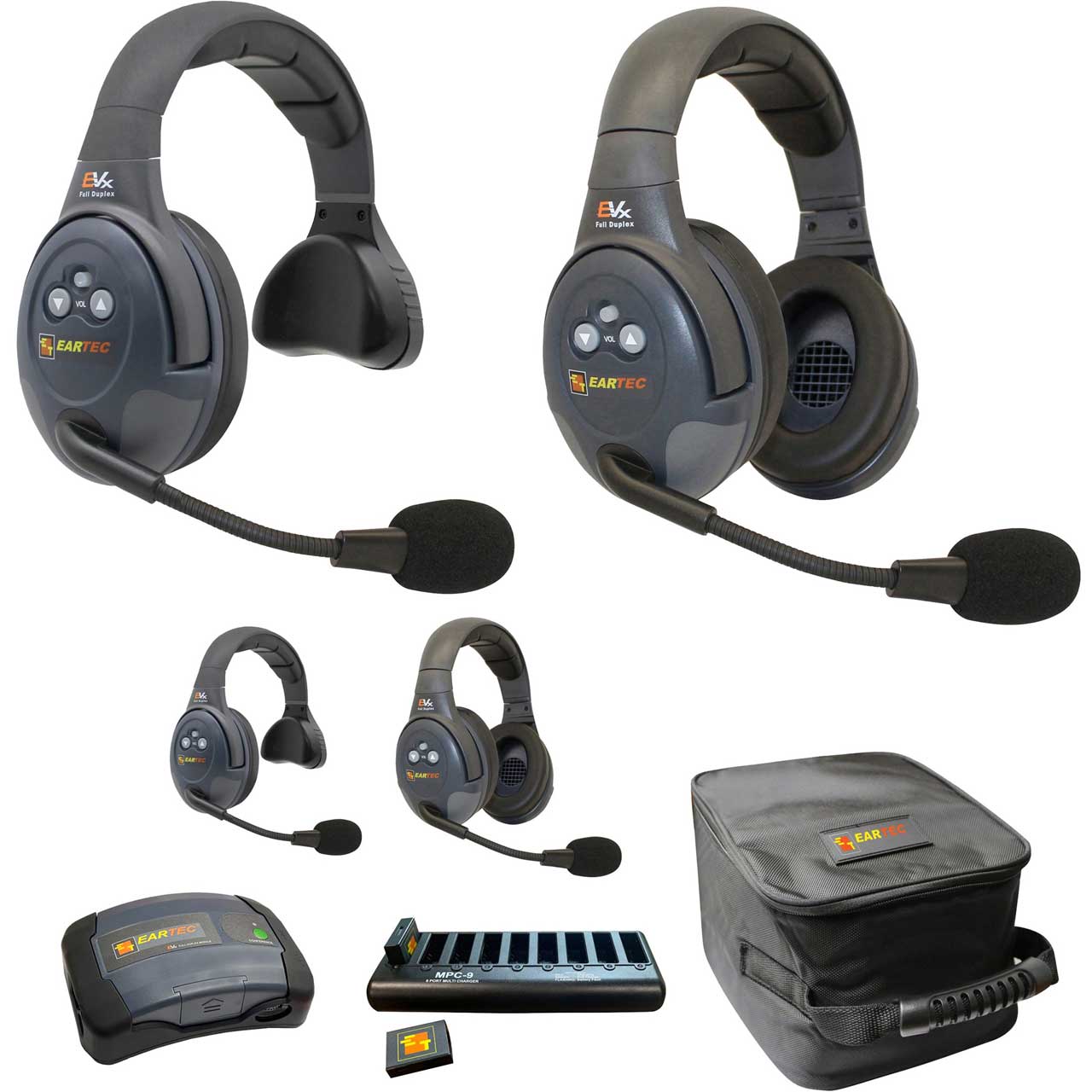 The EVADE Custom Series includes both Single and Double full duplex wireless headsets. There may be situations where individuals on a production team require one ear free to closely monitor what is happening around them while others focus solely on the staff conversation and need both ears covered. The EVADE Custom Series accommodates this and any other scenario where a combination of dual and single ear headsets are required. All EVADE full duplex team communication intercoms allow users to talk simultaneously and hands free within a 1/2 mile range. They include a specialty "MAIN" headset that relays the digital signals transmitted by up to eight "Remote" units. To operate EVADE intercoms simply turn the headsets "ON" and talk, no tuning or base station required. EVADE headsets utilize Frequency Hopping technology automatically switching channels to dodge or "evade" interference. They also include Eartec's Auto Mute Mic boom that cuts off transmit gain when set to the UP position and swivels 270 degrees to be worn on either left or right. The Conference Module (included) provides a staff conference with a single touch of a button. The Conference Module is a compact wireless repeater that expands the capacity of any EVADE system from 9 to 16 users. This lightweight digital transceiver can either belt worn or placed centrally on location and features dual channels allowing two separate crews to talk privately. Pressing the conference button on the Module face connects the entire team, and tapping the button again re-separates the groups. Two Conference Modules can also be interlinked doubling system capacity to 32 users all connected in full duplex mode. Field programmable, smaller set-ups can and be easily expanded to meet your changing needs without factory programming or re-tuning.