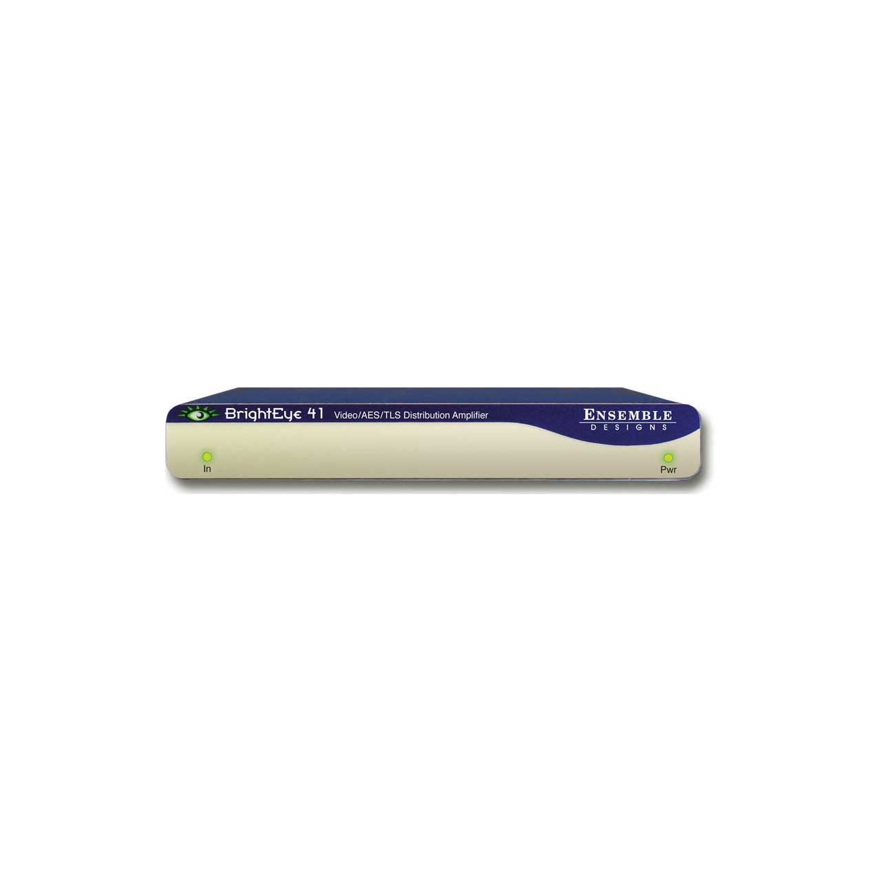 The Ensemble Designs BrightEye 41 is a distribution amplifier that accepts analog video, AES digital audio, or HD Tri-Level Sync signal. It can also be used with SMPTE 310M, Dolby E and AC-3 signals. It provides unity gain fanout over a frequency range of DC to 10 MHz. It can handle composite and component analog video, coaxial AES digital audio, or a High Definition Tri-Level Sync signal.