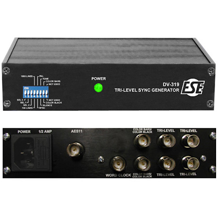 The DV-319 is an HD/SD Sync Generator. Features of the DV-319 include four HD sync outputs. These outputs produce an HD tri-level sync output. Eighteen HD output formats are supported on the DV-319. Also supplied are two SD sync outputs that can be switched between color black or color bar outputs. An AES11 output and a Wordclock output are also standard features on the DV-319. The AES11 output may be switched between silent and tone modes. All outputs are provided on rear panel BNC connectors. Front panel dip switches allow the user to configure the various outputs.