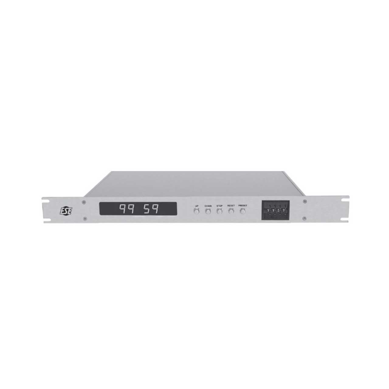The ESE ES-362UE is a 100 Minute Up/Down Timer with Options D and P* factory installed. The ES-362UE is housed in an aluminum/plastic case. The timer is presettable via the front-mounted thumbwheel switch. Up, Down, Stop, Reset-to-zero, and Preset controls are provided on the top of the case. A rear-mounted BNC connector provides the ESE Timer Code for driving remote slave displays. Up to 100 slave displays may be driven, using up to 4000 feet of coaxial cable or twisted pair. A rear-mounted DB-9 connector provides access to remotely control the five pushbutton switch functions. If the relay contact closure option is ordered, the contacts are also accessible on this connector.