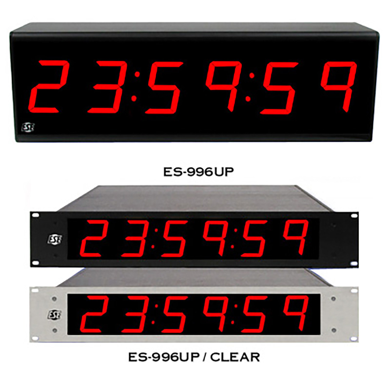 The ESE ES-996U is a Time Code display featuring 2.3" high red LED displays. The unit is housed in a black-textured aluminum wall-mount enclosure (5" H x 15" W x 3.5" D). The unit accepts, via the rear-mounted terminal block (BNC connector on rack-panel units), either ESE Time CodeT (TC76T, TC89T, or TC90T) or SMPTE/EBU Time Code. RS-232C ASCII Time Code (format "0", "1" or "A" at 9600 baud) may be input via the rear-mounted 9-pin connector. The ES-996U will automatically determine which code is being received. A rear-mounted DIP switch is used to configure the display for 12 or 24 Hour format, or to display the Date instead of time-of-day (if incoming time code contains Date information, such as ESE TC90, date-encoded SMPTE/EBU or ASCII formats "1" or "A"). If the Time Zone option is ordered, a rear-accessible DIP switch is installed for this function. If receiving ESE Time CodeT from a timer, the unit will display Minutes, Seconds and Tenths of Seconds (if the timer has the Tenths option).