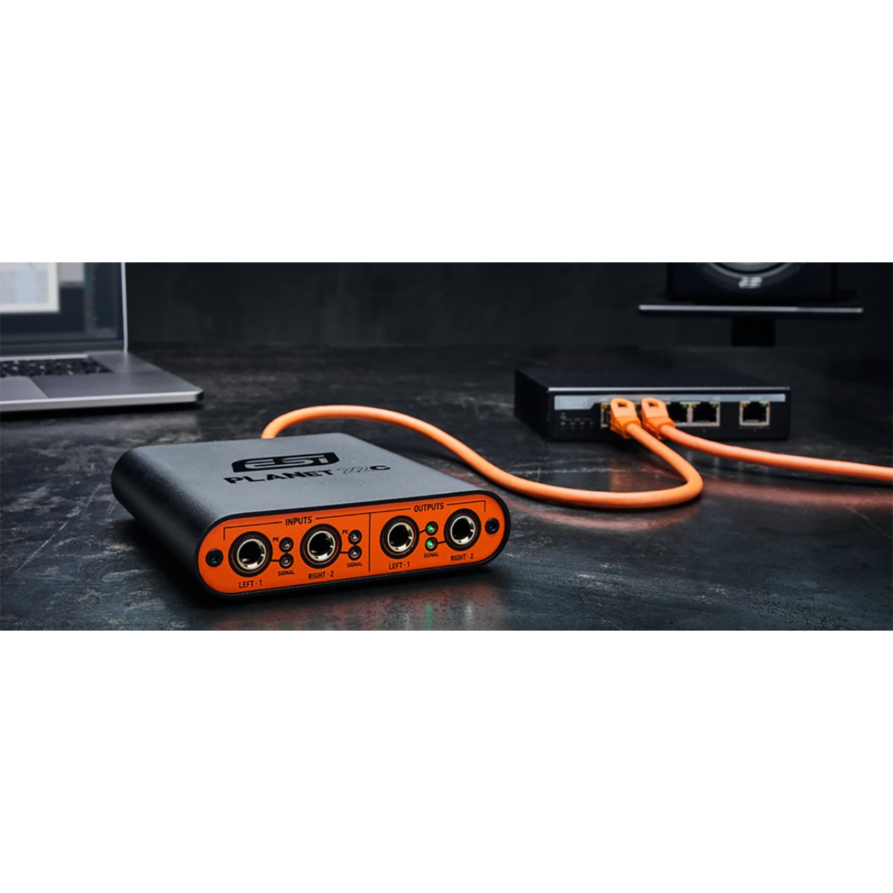 ESI's planet 22c is an extremely compact interface box that provides 2 analog input and 2 analog output channels at pristine reference audio quality in a Dante IP audio network.