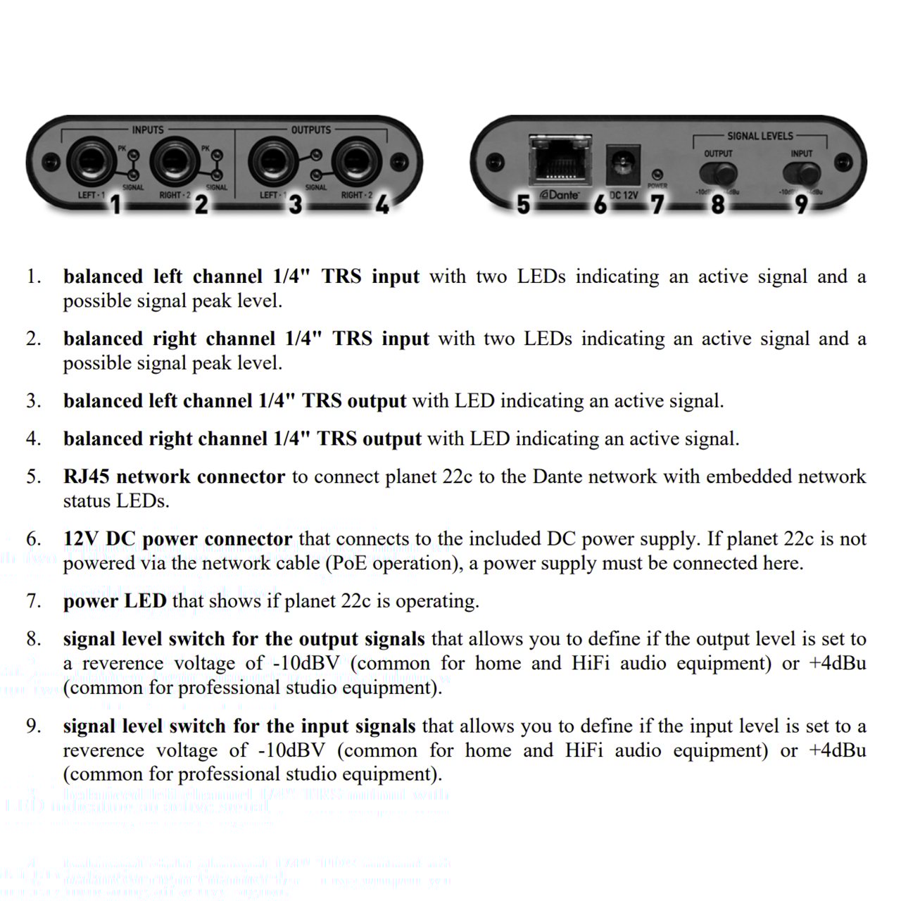 This makes planet 22c ideal to interface any analog equipment such as a traditional mixer, studio monitors or PA speakers, synthesizers or other electronic instruments and much more with the Dante world. The linear frequency response and excellent audio quality even makes planet 22c ideal for audio measurement purposes.