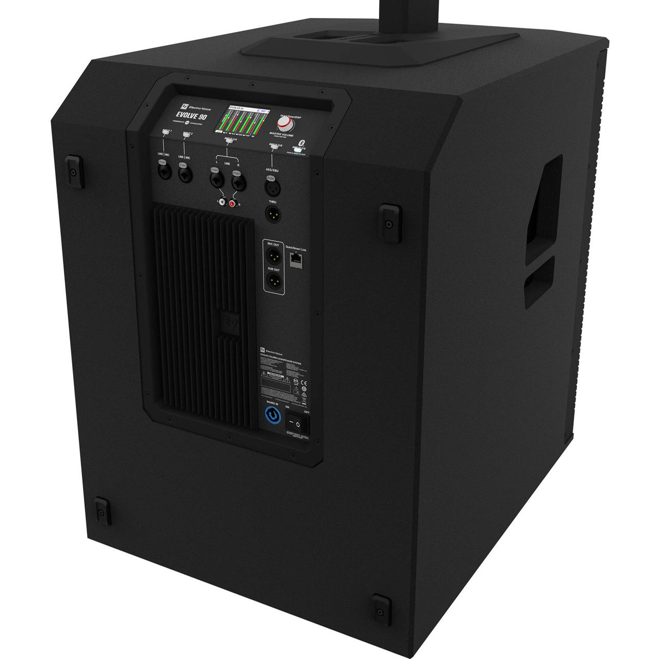 System setup is simple and fast. Slide the magnetically locking mounting pole into the appropriate port on top of the subwoofer, then place the column speaker array on the pole. The EVOLVE 90 subwoofer features an advanced mixer with professional-grade mic preamps and mix functions. High-resolution, low-latency Bluetooth audio streaming ensures professional-quality results for music playback or accompaniment. There are mic and line inputs via XLR-1/4" combo jacks, stereo RCA, and digital AES/EBU (XLR) input jacks as well as XLR Mix and Sub outputs. The EVOLVE 90 subwoofer ships with a power cord.