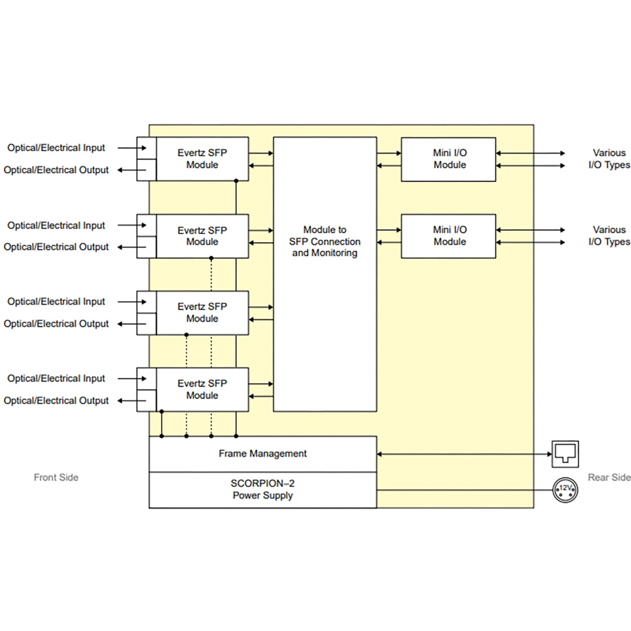 The Evertz SCORPION-2 Media Processing Platform is a miniature form factor, multi-service signal conversion, aggregation enclosure capable of simultaneously transporting video, audio, and data services over Ethernet or fiber networks. Using SCORPION MIO modules, the SCORPION-2 is highly flexible and can accommodate a multitude of video, audio, and data signals. The SCORPION-2 will take on the function of the mini I/O module installed and can become a standalone IP gateway, miniature throwdown encoder, or dark fiber media converter, to highlight a few use cases.