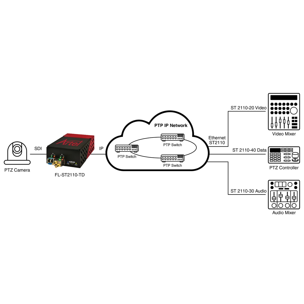 The product leverages Precision Timing (PTP) for synchronization across all streams to ensure packets are precisely assembled, reassembled, ordered and synchronized across Ethernet infrastructure using PTP switches, such as the Artel Quarra products.