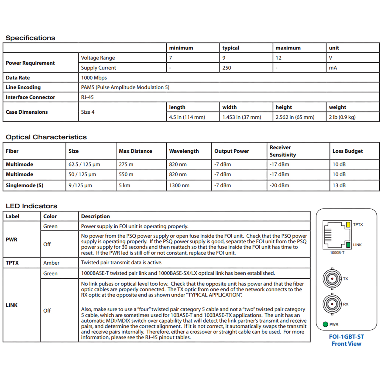 A typical link consists of two FOI-1GBTs, one at each end of the network, with a duplex fiber optic cable in between.