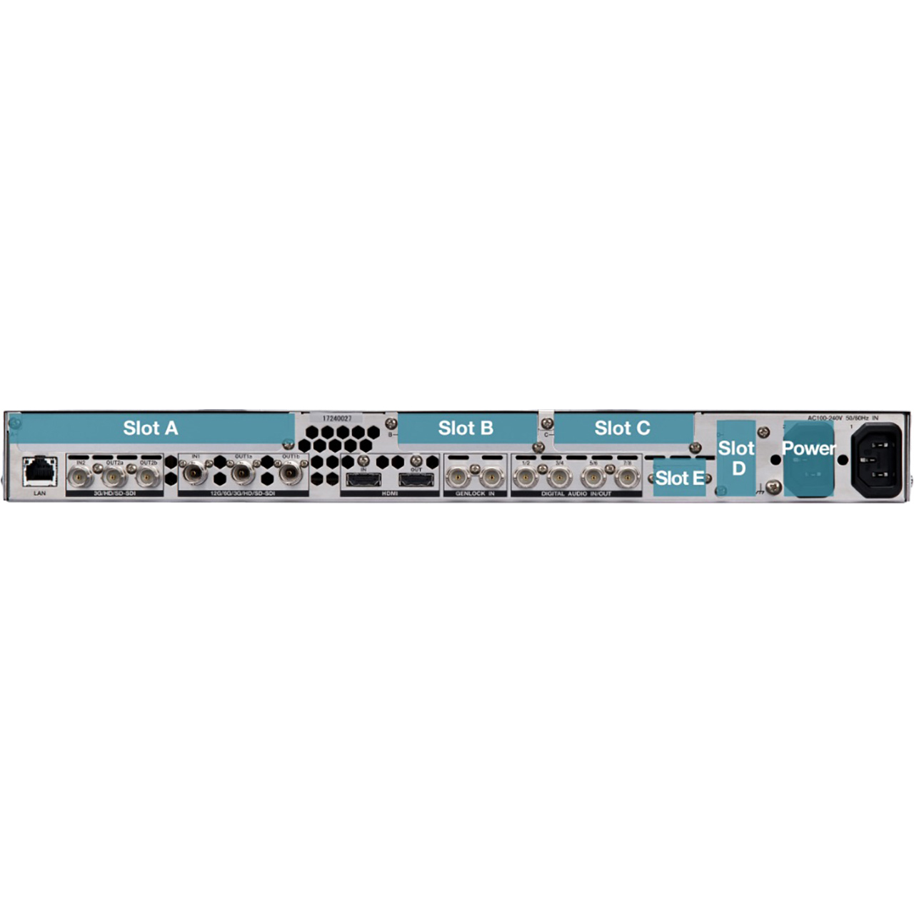 The FA-9600 can be upgraded by installing optional modules into Slot A, B, C, D.& E. Option cards must be installed into the correct slots, Option FA-96ANA-AUD is a balanced analog audio 4-in/4-out card. This card is reserved for slot "B" on the FA-9600.
