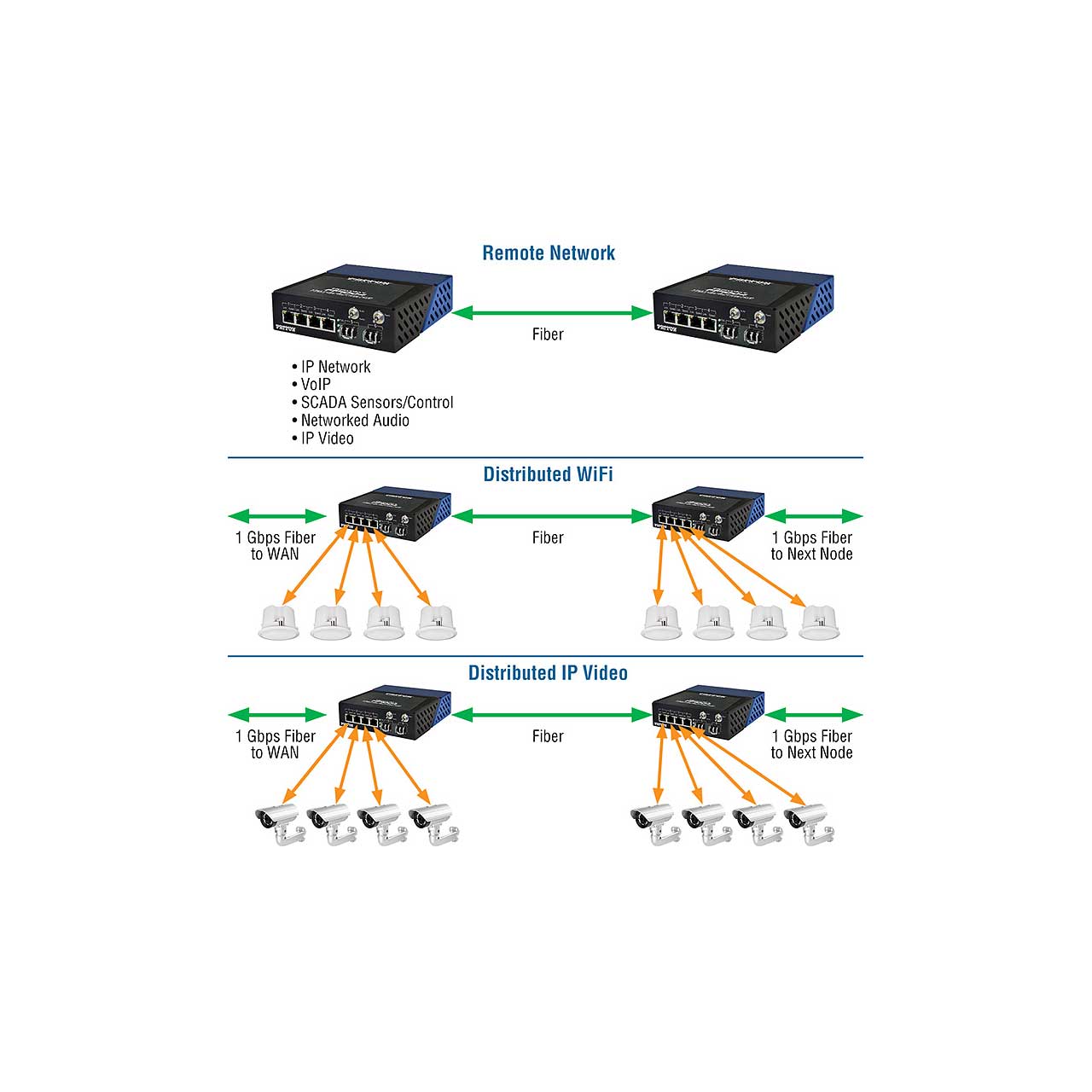 The FiberPlex FP1004E/2L5B/EUI is elegantly simple yet packed with an advanced feature set, the FP1004E is a powerful 6-port 10/100/1000 Light Industrial Ethernet switch. The unit features (4) RJ-45 UTP ports as well as (2) flexible SFP ports. Two or more FP1004E can be chained together via fiber to provide a distributed solution where isolation, distance, security and/or noise immunity is needed between nodes.