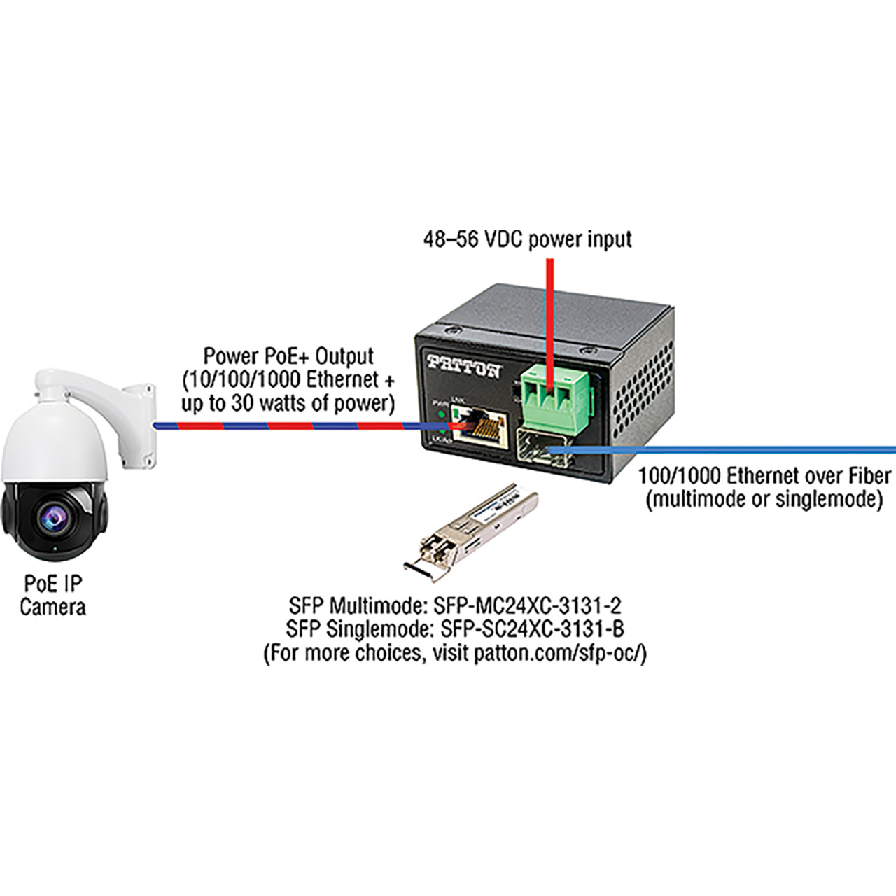 Patton's FiberPlex FP101EM/AT converts singlemode or multimode fiber to a copper Ethernet signal. With the built-in PoE+ (Power over Ethernet) injector and a local power source, you can easily and reliably extend both power (30W/PoE+) and 10/100/1000 Mbps Gigabit Ethernet to a PoE/PoE+ end-points such as IP security cameras, IP speakers, VoIP phones, wireless access points, POS kiosks, BACs, PLCs and more.