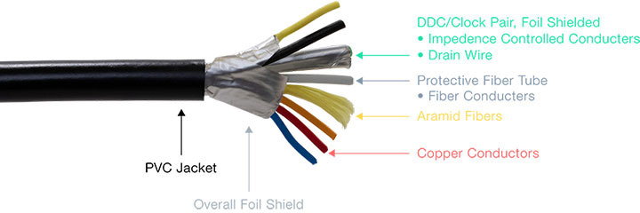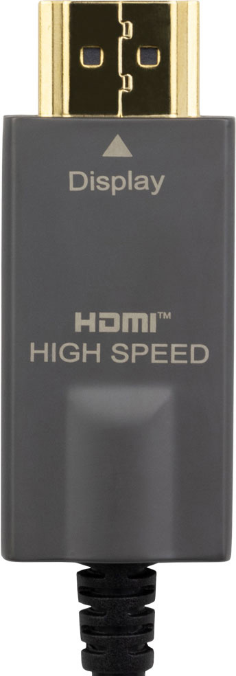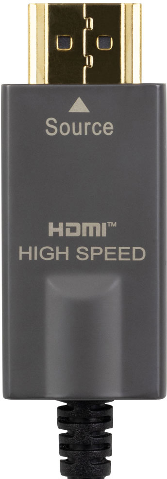 The cables come pre-terminated in convenient lengths, in this instance it's 30 meters (100 feet). These advanced technology cables use four glass fibers, seven copper wires and supply the necessary power to the embedded circuitry at both ends of the cable. They meet the HDMI 2.0 / HDCP 2.2 testing standards. The connector shells are labeled "source" and "display" to aid in proper connections.