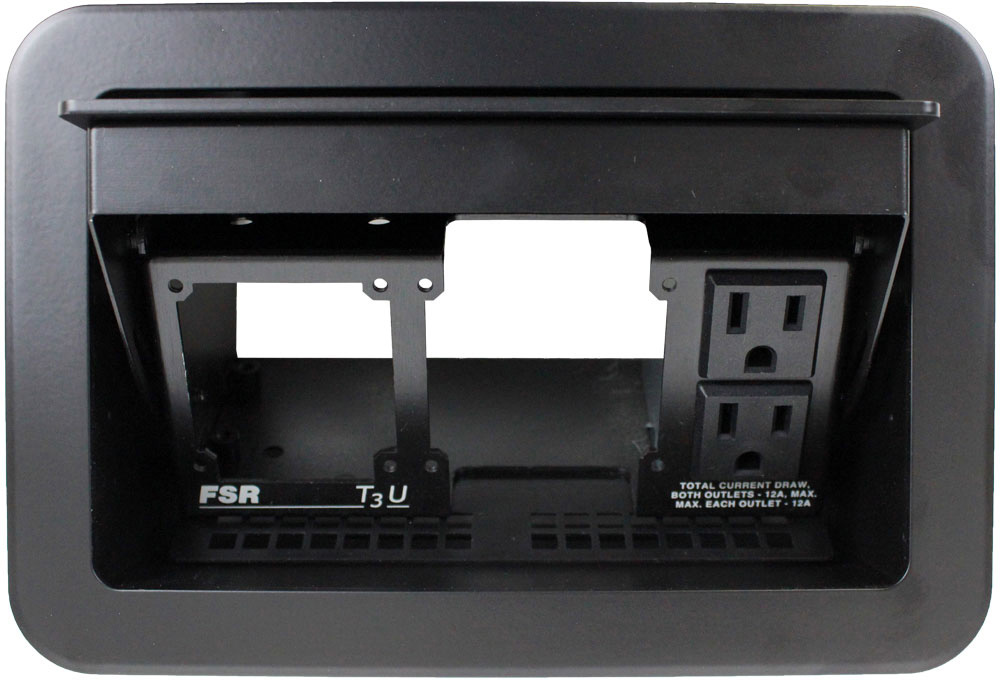 The T3U-2R-BLK T3U RIM Series (Table Top Tilt Up) table boxes. Designed expressly for applications requiring multiple access boxes within the same table, the FSR T3U RIM Series handles data, power, and AV connections in a low profile box.