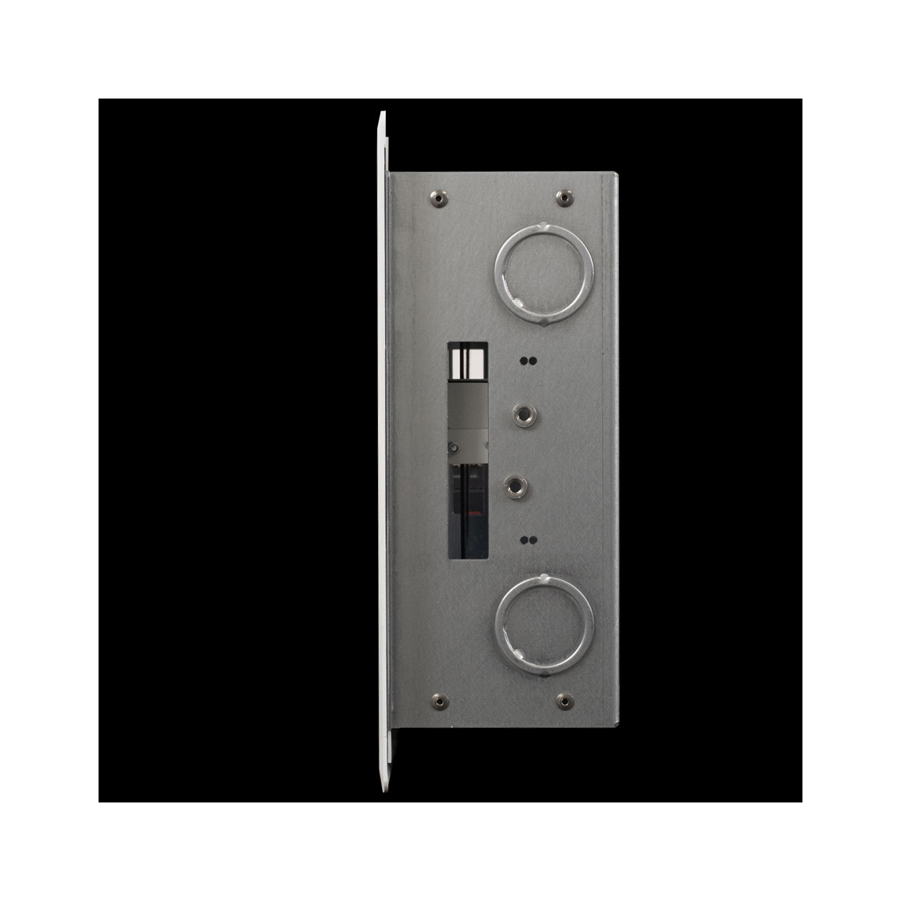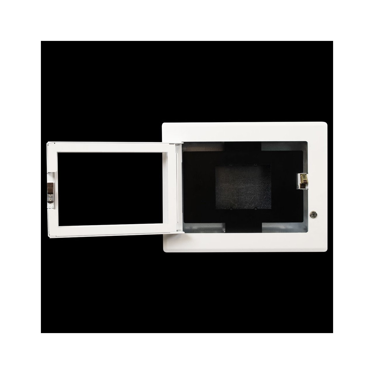 The FSR WB-TSC-FM-7 surface-mount touchscreen wall boxes are metal locking covers with clear acrylic windows designed to protect and restrict access to 5 to 10-inch touch panels mounted on a 2-gang back box. These wall boxes ensure clear visibility of wide-format displays while maintaining a sleek, low-profile design. The flushmount touchscreen wall boxes offer the same protection and monitoring features as their surface-mount counterparts but are designed to install flush to the wall. The flush-mount models are compatible with controllers up to a maximum panel size of 10.3" W x 8" H x 1.75" D. Panels with other mounting requirements can be supported; contact the factory for details. The flush mount is designed to blend seamlessly with any environment and boasts a sleek, flush design. The 180-degree hinge design allows the door to lay flat against the wall when open, providing users with unencumbered access to the front panel and making maintenance and operation hassle-free. The enclosure can be installed in landscape or portrait orientation; in landscape, the door can be mounted to open left or right; in portrait, the door swings up or down. This flush mount touchscreen wall box provides security against unauthorized access while allowing users to monitor the control panel's status through the clear window without opening the locked door.